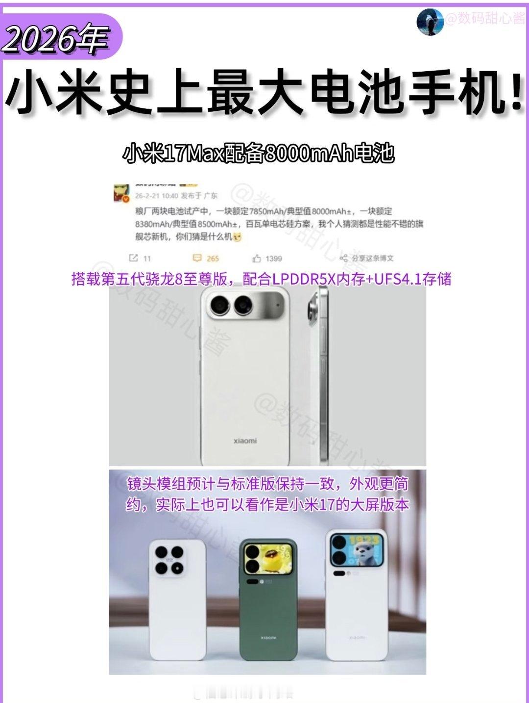 小米史上最大电池手机曝光就是之前曝光的小米17 Max,没有背屏,电池🔋更大!啥时候突破10000mAh?