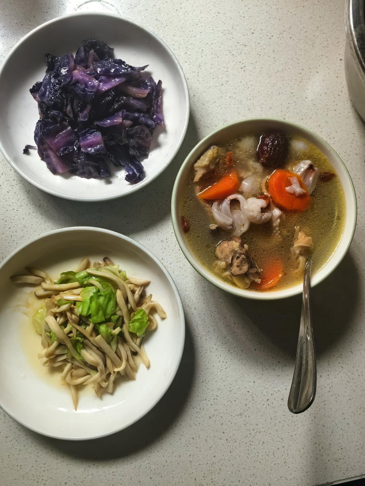12:50荔枝爆汁鸡汤 素菜:紫甘蓝,鸡腿菇+青菜晒晒我的今日美食