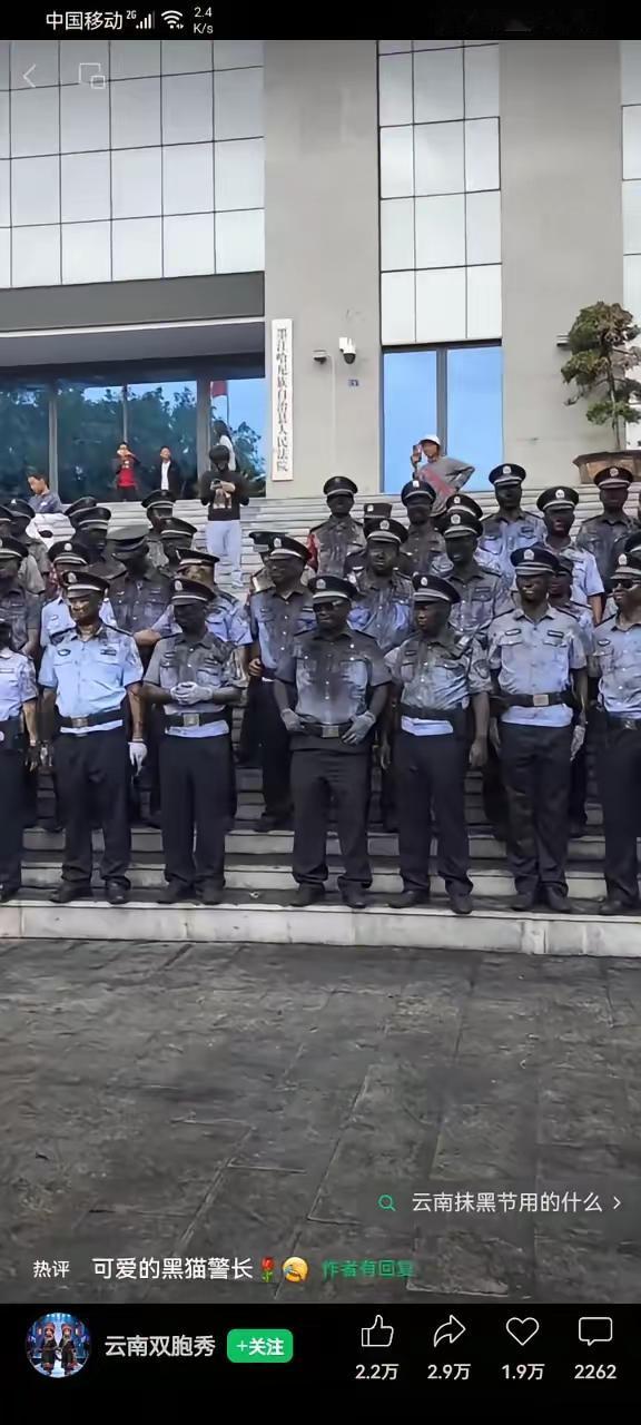 除了节日,否则谁敢在警察脸上动手,[捂脸]这是云南墨江哈尼族每年五月一日的太阳节及双胞胎节,节日传统的活动“摸你黑”颜料是特制的,无害的。抹黑代表着对人的祝福,过节的人很多,大家玩的都很嗨,还有特色的长街宴,有好吃的竹笋,烧烤,体育场的烤鱼等等,好吃的太多了!