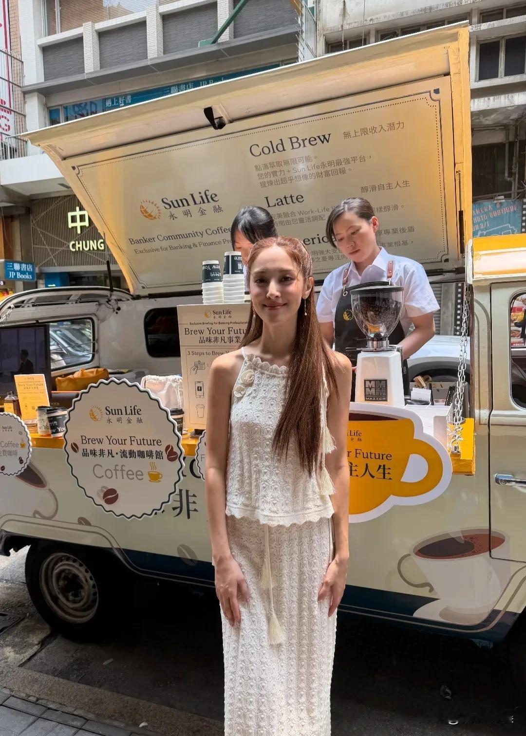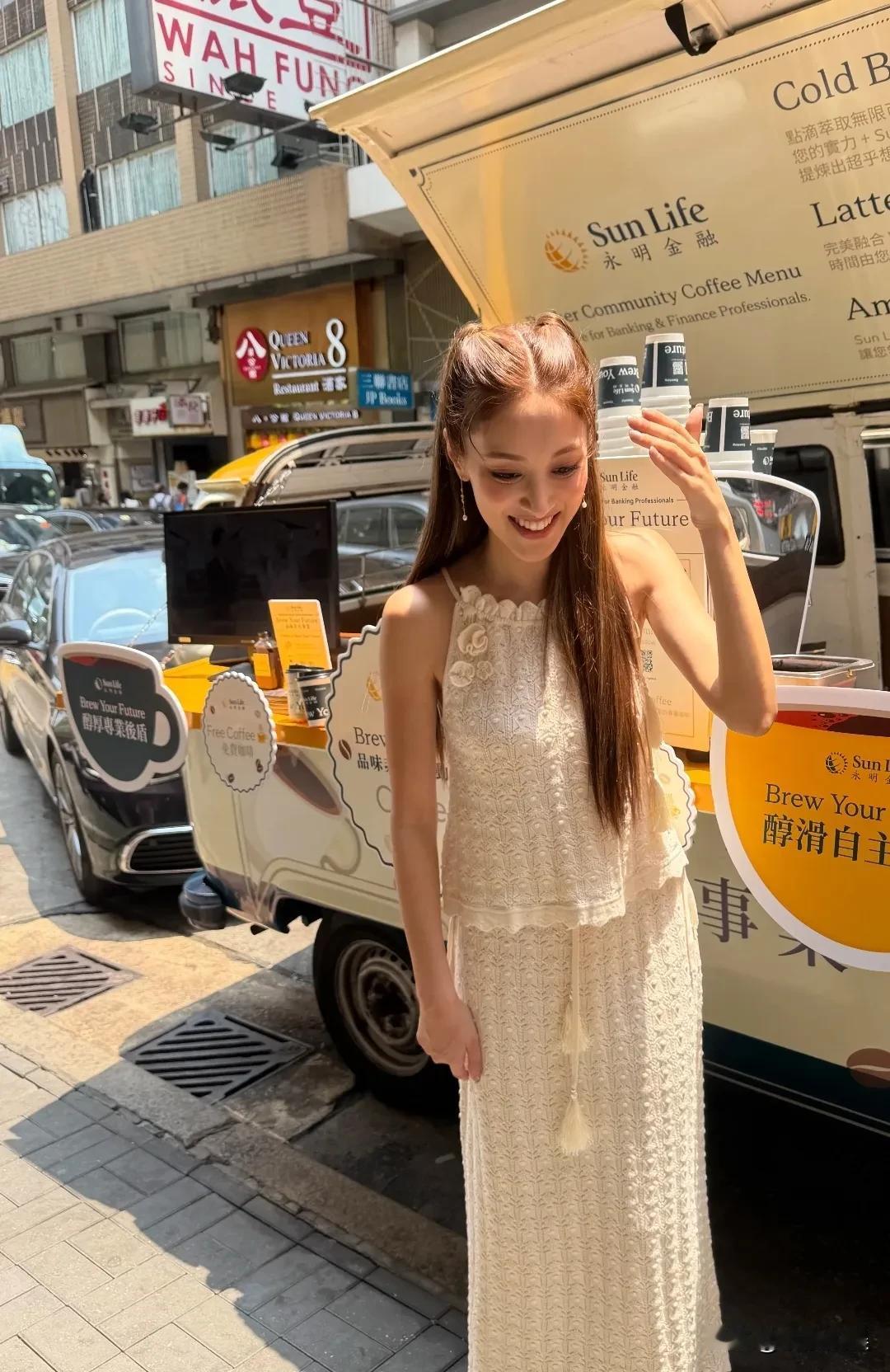 她现身中环为某咖啡站台,现场派送咖啡,扎着双马尾,穿着白色吊带长裙,个子高挑纤瘦。