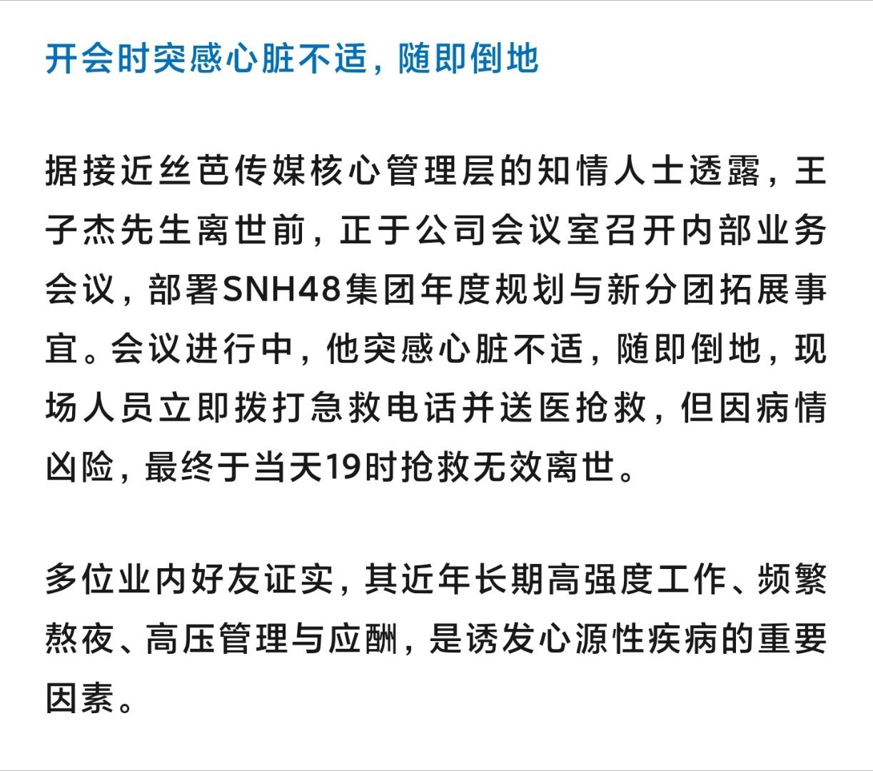 【王子杰开会时突然倒地】王子杰去世前正安排SNH48事宜据接近丝芭传媒核心管理层的知情人士透露,王子杰先生离世前,正于公司会议室召开内部业务会议,部署SNH48集团年度规划与新分团拓展事宜。会议进行中,他突感心脏不适,随即倒地,现场人员立即拨打急救电话并送医抢救,但因病情凶险,最终于当天19时抢救无效离世。(北京青年报)丝芭总裁王子杰去世