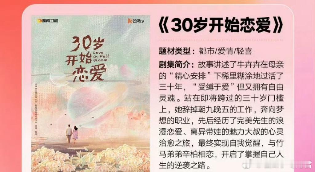 湖南卫视都市剧《30岁开始恋爱》张予曦、代旭编剧:张冰雪、王娇导演:吴强《浮图缘》出品:芒果tv 湖南卫视类型:都市/爱情/轻喜