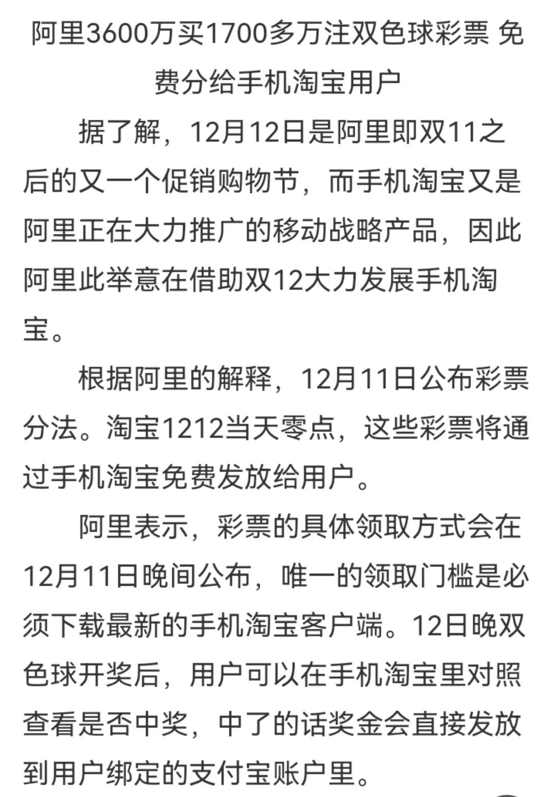 记得当时马云为了庆祝双12活动,就搞了这么一出,花3600万买下双色球所有组合,总计1770多万组号码,免费发放给用户。