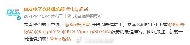 在该评选结果发布之后,BLG官方也是第一时间转发庆祝,并且配上了“恭喜我们的上单选手Bin获得周最佳选手,恭喜我们的上中下辅Bin、Knight、Viper、On 获得周最佳阵容,团队致胜!新的一周继续加油!”。