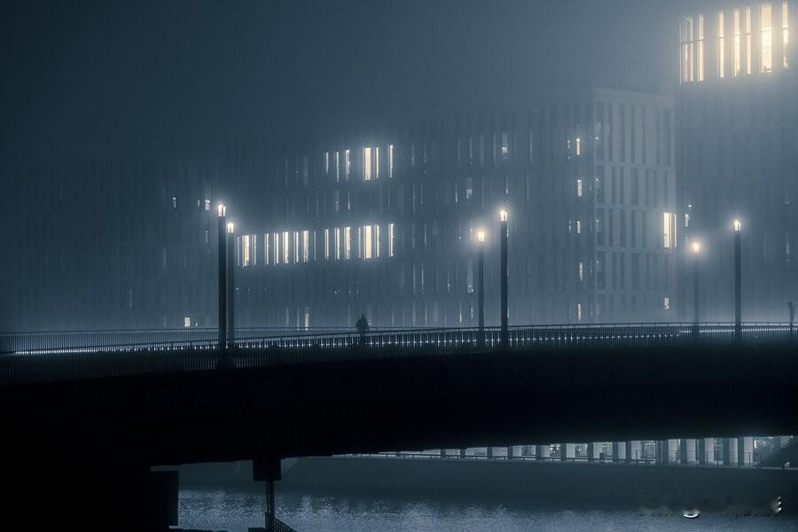 他的“孤独城市”风格,源于对城市“双面性”的观察——白天的城市喧嚣、拥挤,而午夜的城市则变得安静、孤独,这种反差让他着迷;同时,波茨坦的多雾天气,为他提供了天然的创作条件,朦胧的雾气能弱化城市的繁杂,突出建筑的轮廓,加上冷色调的运用,更能凸显现代都市的疏离与孤独,形成了超现实的孤独感,也映射出都市人的内心状态。