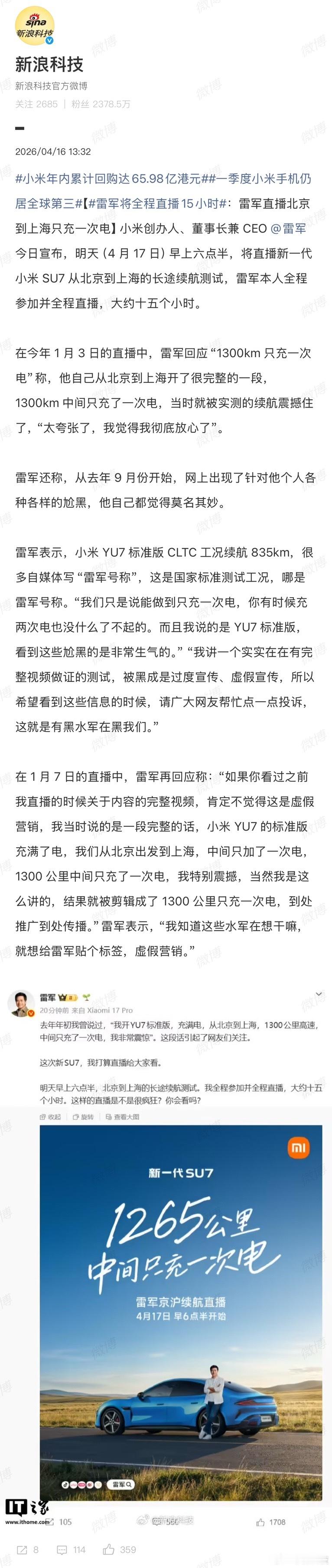雷军将于4月17日早上6:30开启一场长达约15小时的全程直播主