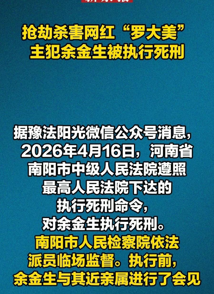 余金生,已被注射,43岁结束一生,回想那么残忍杀害罗大美,今天下场咎由自取!网传与沙玉娇同居前,2019年与另外一名女子结过婚,有一个孩子,初中没毕业,一直不务正业,得过且过荒废的人生!同案杨恒、沙玉娇被判刑在坐牢,罗大美案至今2年半,尘埃落地,悲剧再次警示世人!本本分分挣钱过日子,不要胡作非为,最终害人害己!