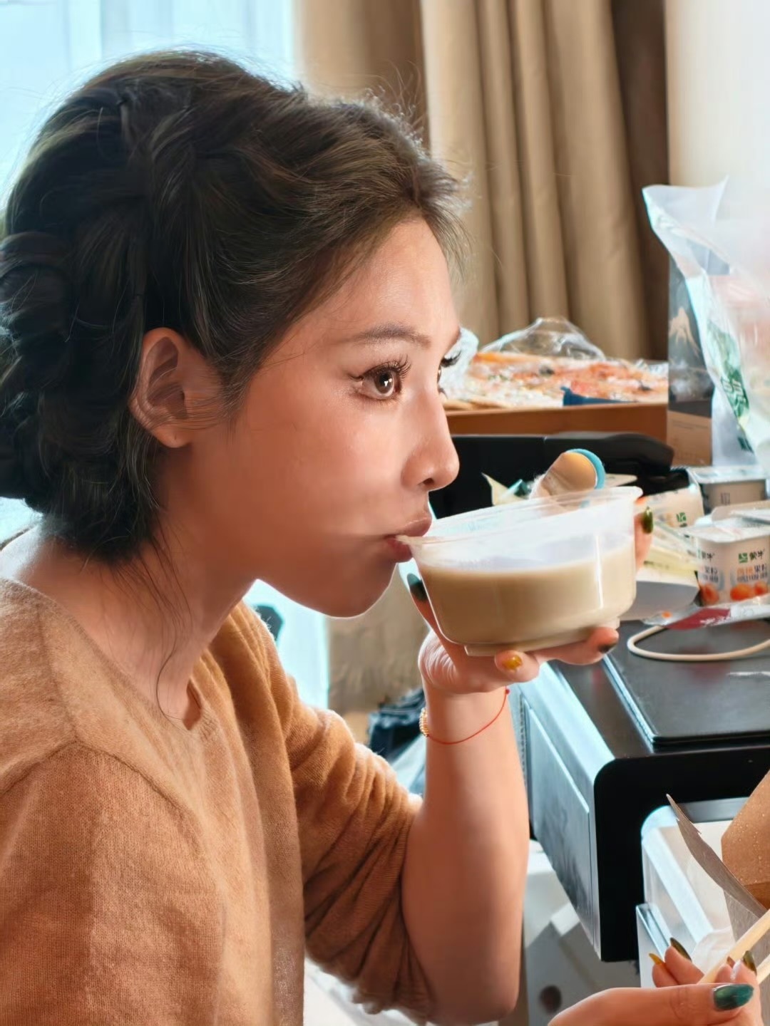 彭小苒走红毯前喝豆汁期待彭小苒今天北影节开幕式,美女很自律了期待今天漂亮的红毯妆