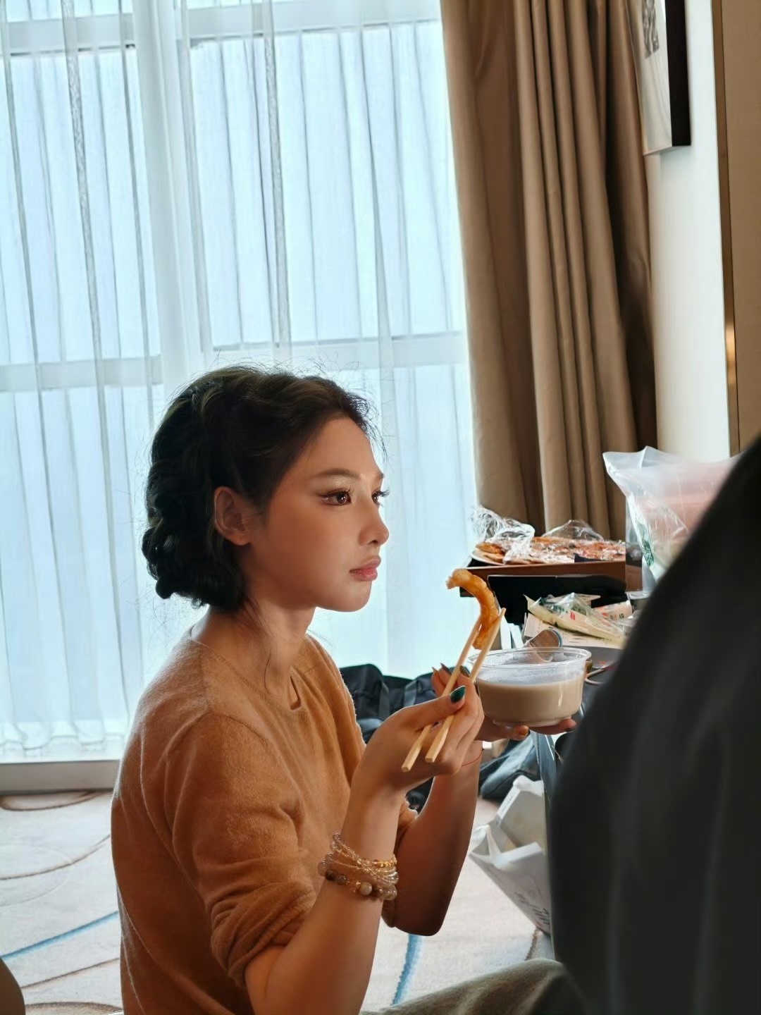 彭小苒走红毯前喝豆汁期待彭小苒今天北影节开幕式,美女很自律了期待今天漂亮的红毯妆造