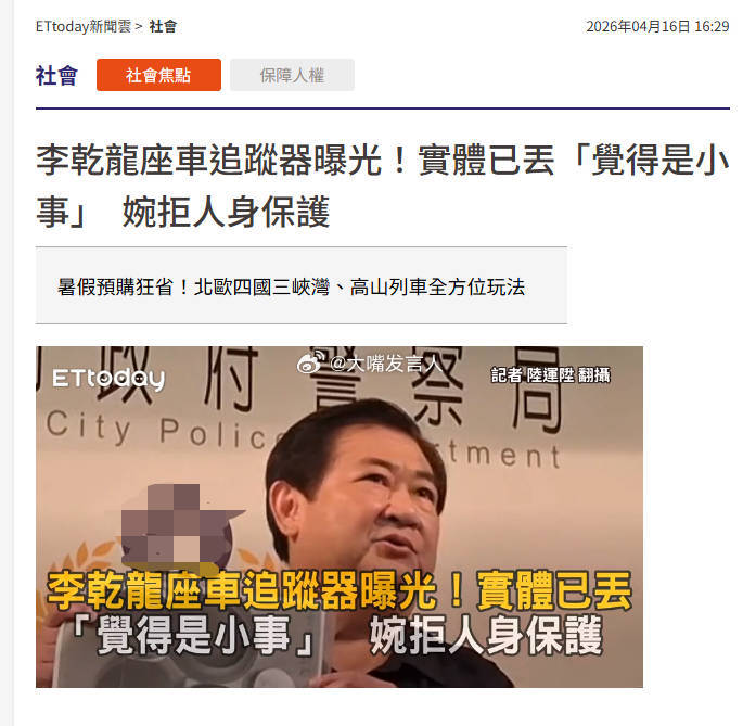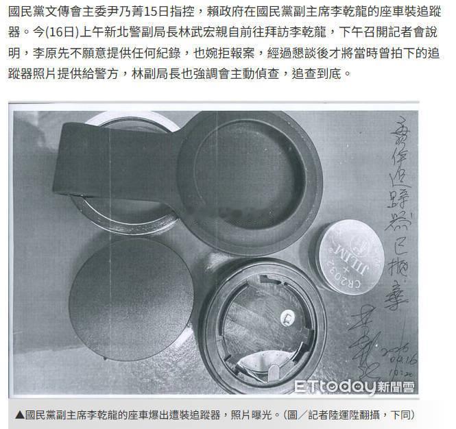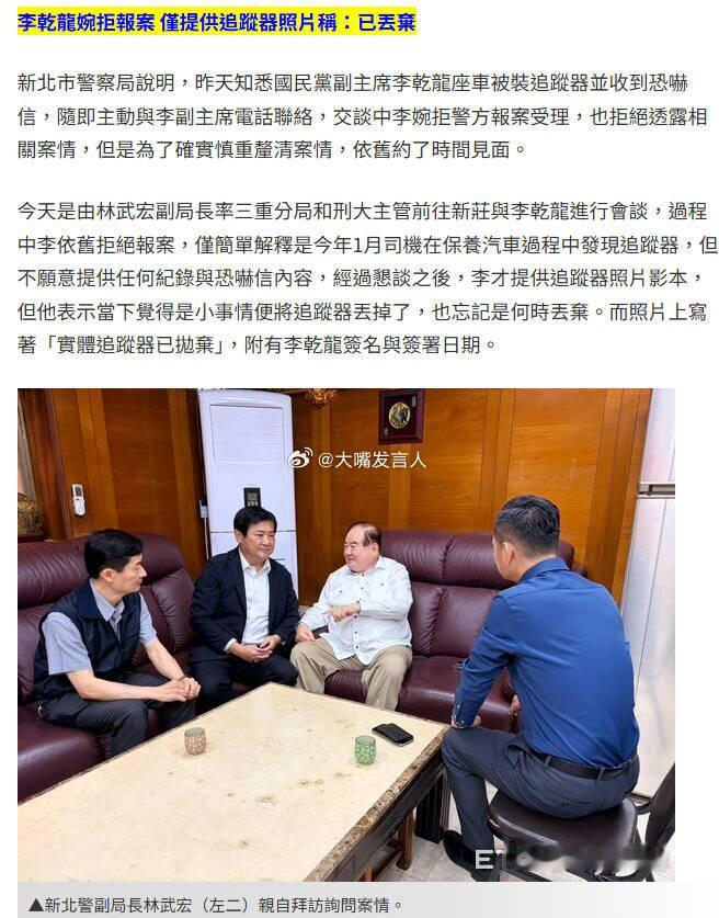 湾湾省蓝营大聪明们办的事呀昨天尹乃菁公开声讨绿蛙赖皮德,说蓝营副头领的座车上被安装了追踪器(图4),不仅要求赖收手,还威胁赖退任后可能会被起诉。但尹当场又说了,蓝营不想把事情闹大、不报案昨天看到新闻,我以为是近几天,尤其是郑丽文、李乾龙、尹乃菁访问大陆之后,李的车被装了追踪器结果,今天湾湾省新北市的阿sir们就直接上门找李乾龙了(图1),要主动办案,李不得不进一步解释案情,说是今年1月份,司机在保养车辆时发现了追踪器,但李不愿意提供其它信息线索,并说觉得是小事、已丢弃追踪器。经过阿sir们“恳谈”(图3),李最终提供了所谓追踪器的照片,并在照片上写下承诺,“实体追踪器已抛弃”(图2),并签名写上今天的日期蓝营本来想闹个大事,结果被现实打脸,尹乃菁那边开骂、指责,说追查到底(图5),这边李乾龙说是小事、不报案、主动承认自己抛弃证据、并说明事发今年1月份哈哈哈,这就是目前湾湾省蓝营人物的水准,这智伤热点观点 ,警察带台湾同胞走中国公民专用通道,