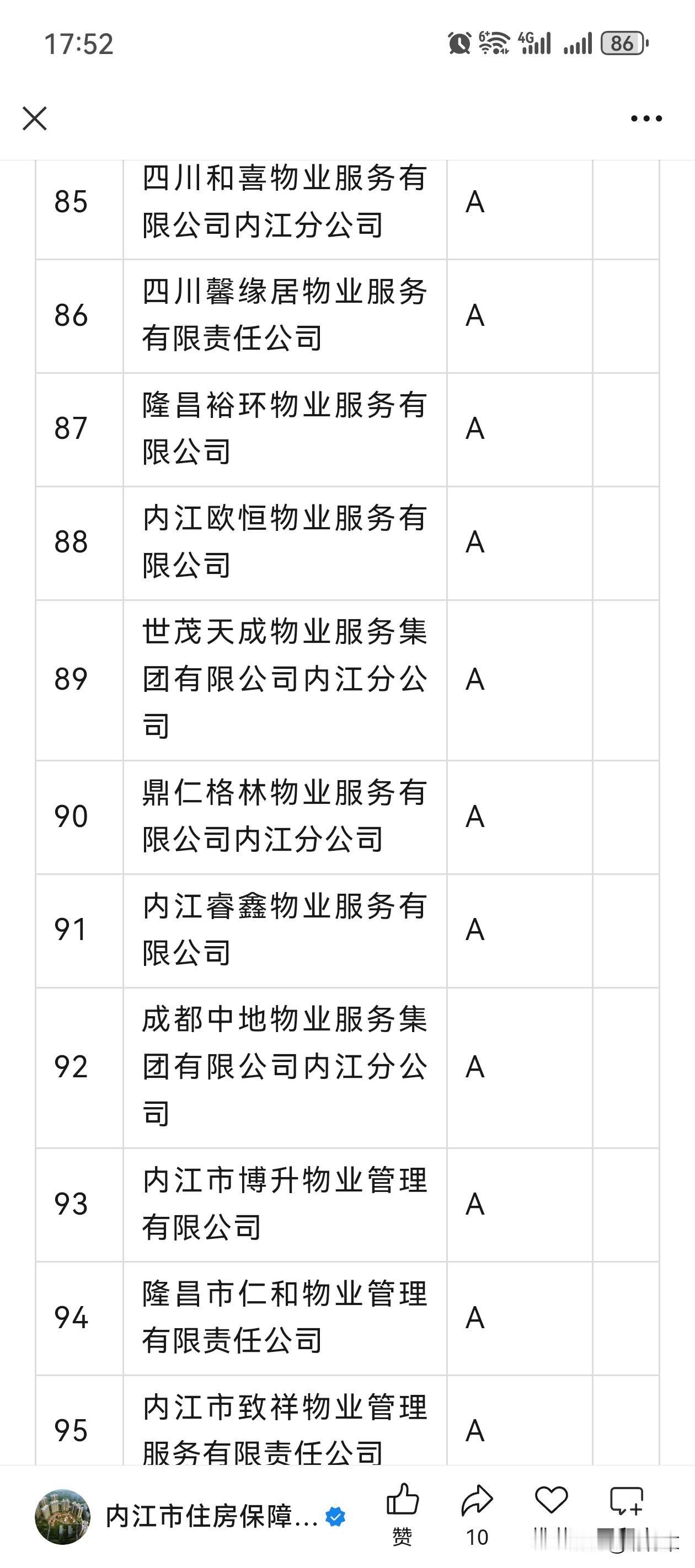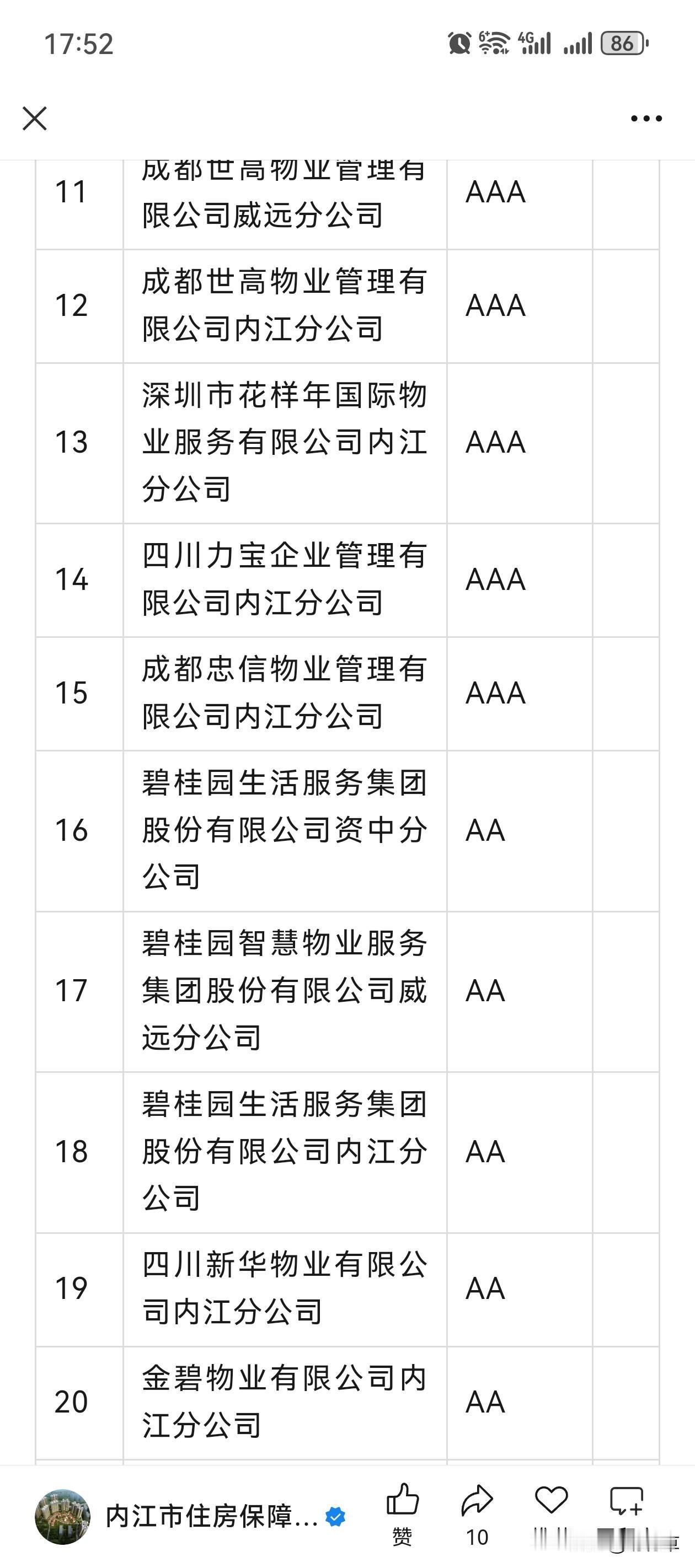刚刚看到内江市住房保障和房地产服务中心发布的内江市物业服务企业信用等级公示。有意思的是我住的小区物业,物业费0.9元,信用评级是AAA级(物业服务是真的好)。而我所买的买商铺小区物业,商铺物业费4元,住宅物业费2.2元,停个自行车都匪夷所思的要收月租费。小区装修工人衣服放车上都能被偷,业主被偷也常发生,居然还能是A级。这是因为没有再低的等级了吗。关键这样的物业还说自己是顶级服务[笑哭][笑哭][笑哭]黑榜物业