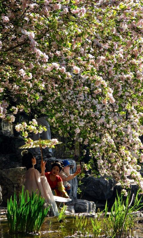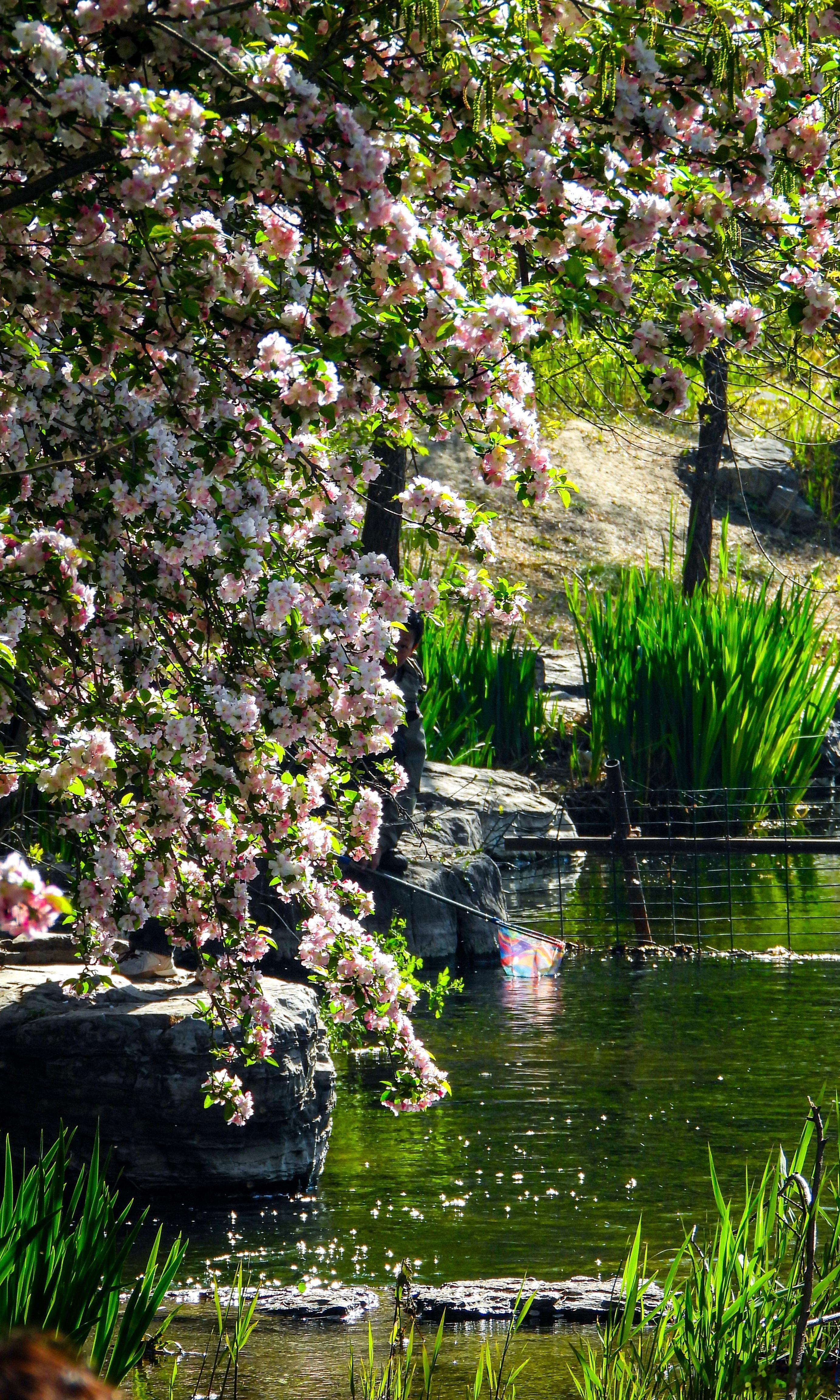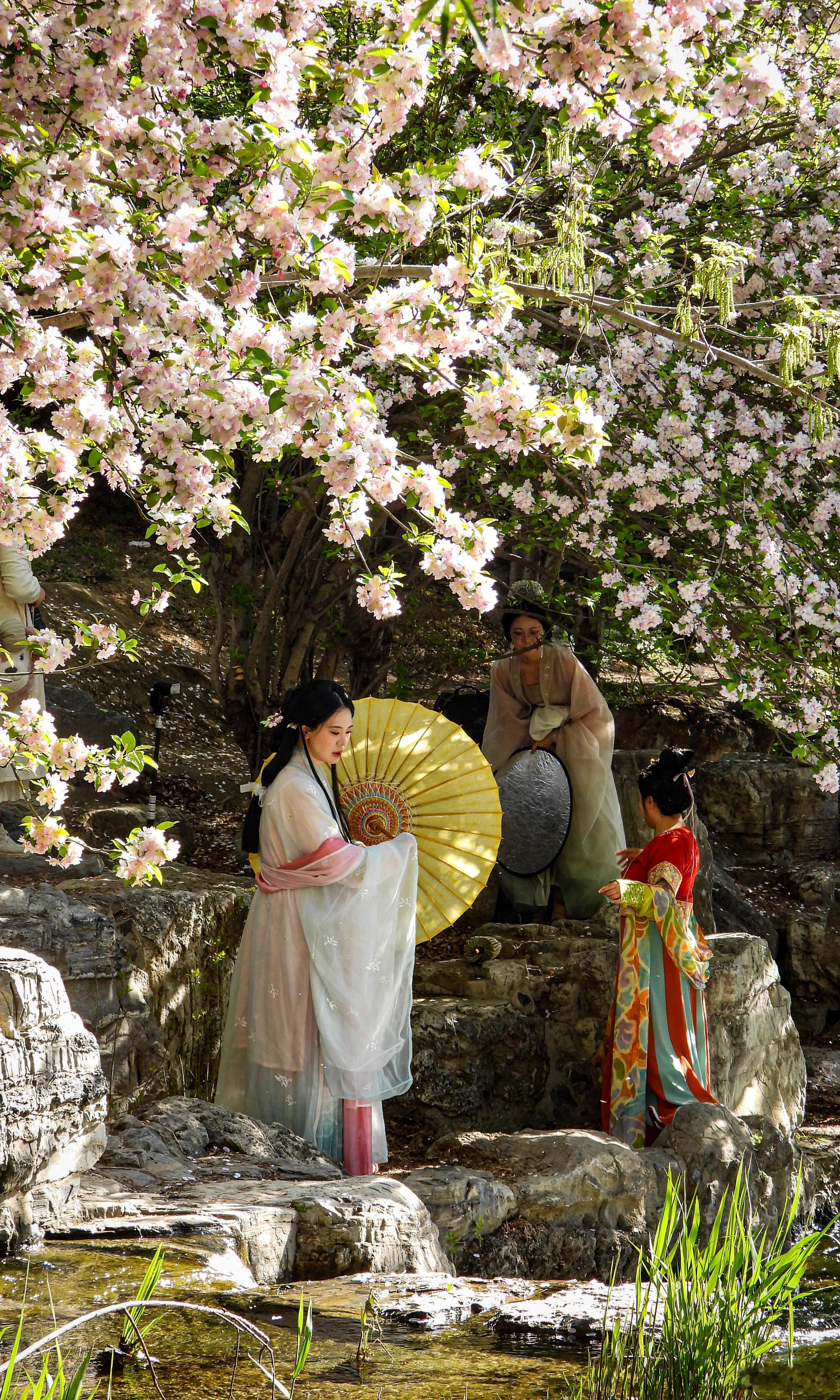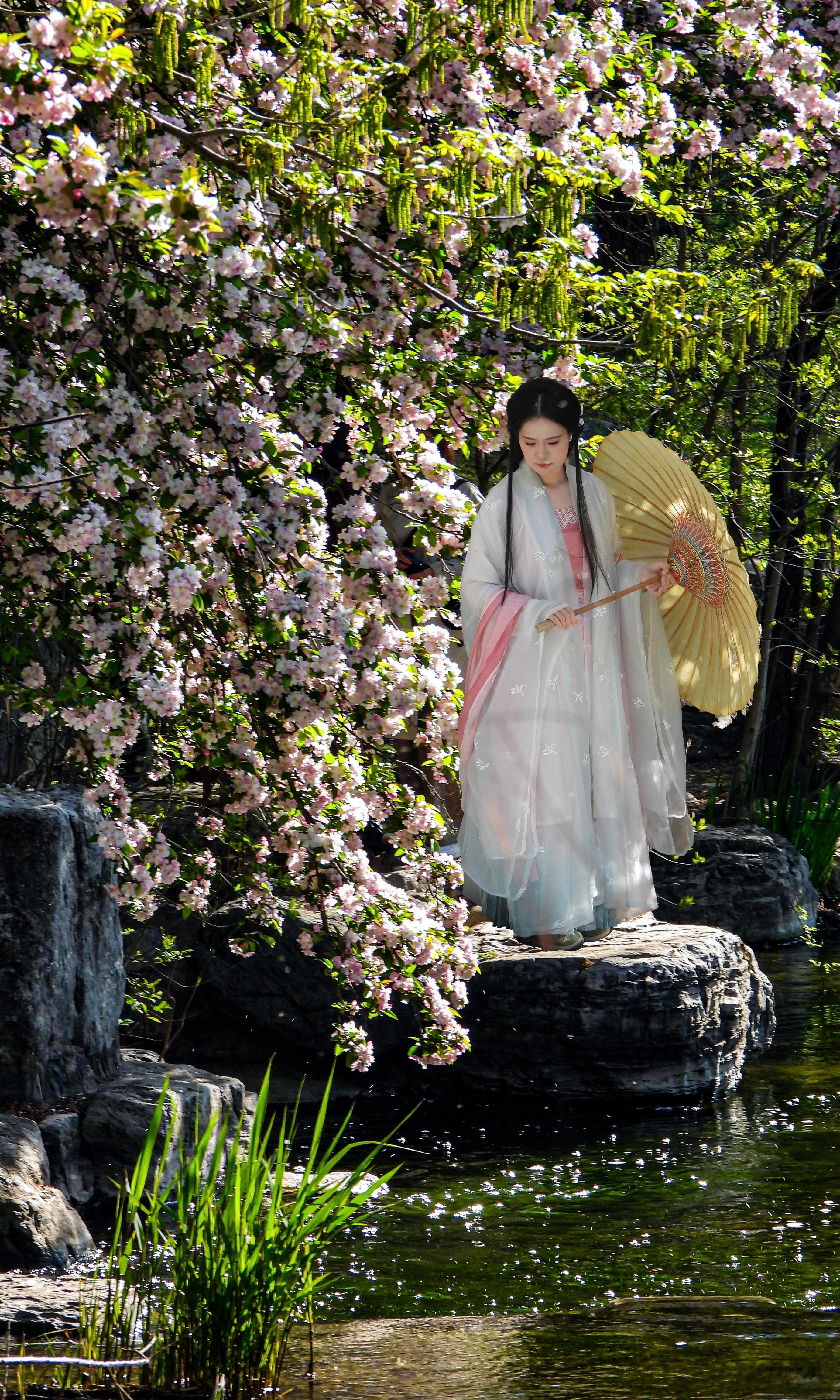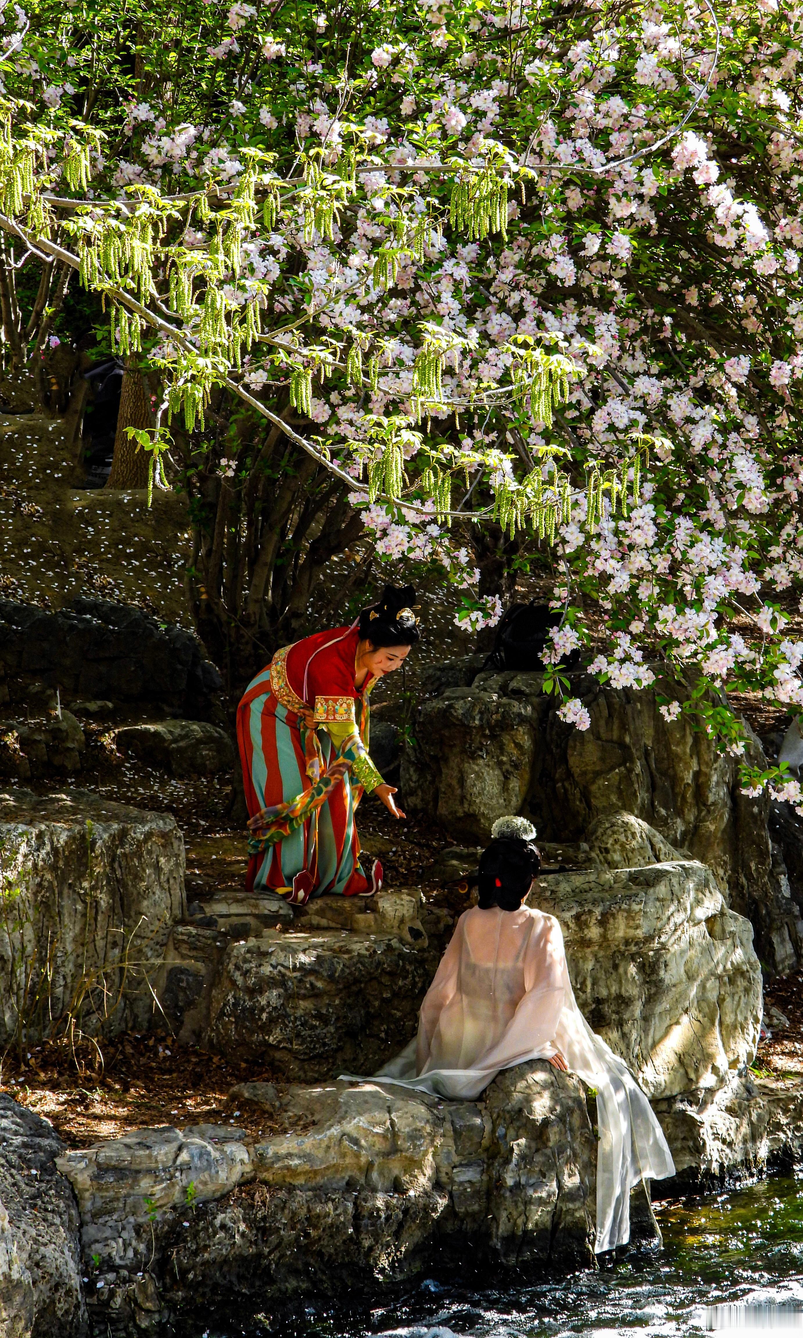 【奥林匹克森林公园 海棠花溪】奥森春事晚,水畔海棠稠。粉雪覆危石,红妆照浅流。衣轻随蝶舞,伞软载香浮。忽忆浣花意,嫣然一倚眸。摄影北京春日氛围感
