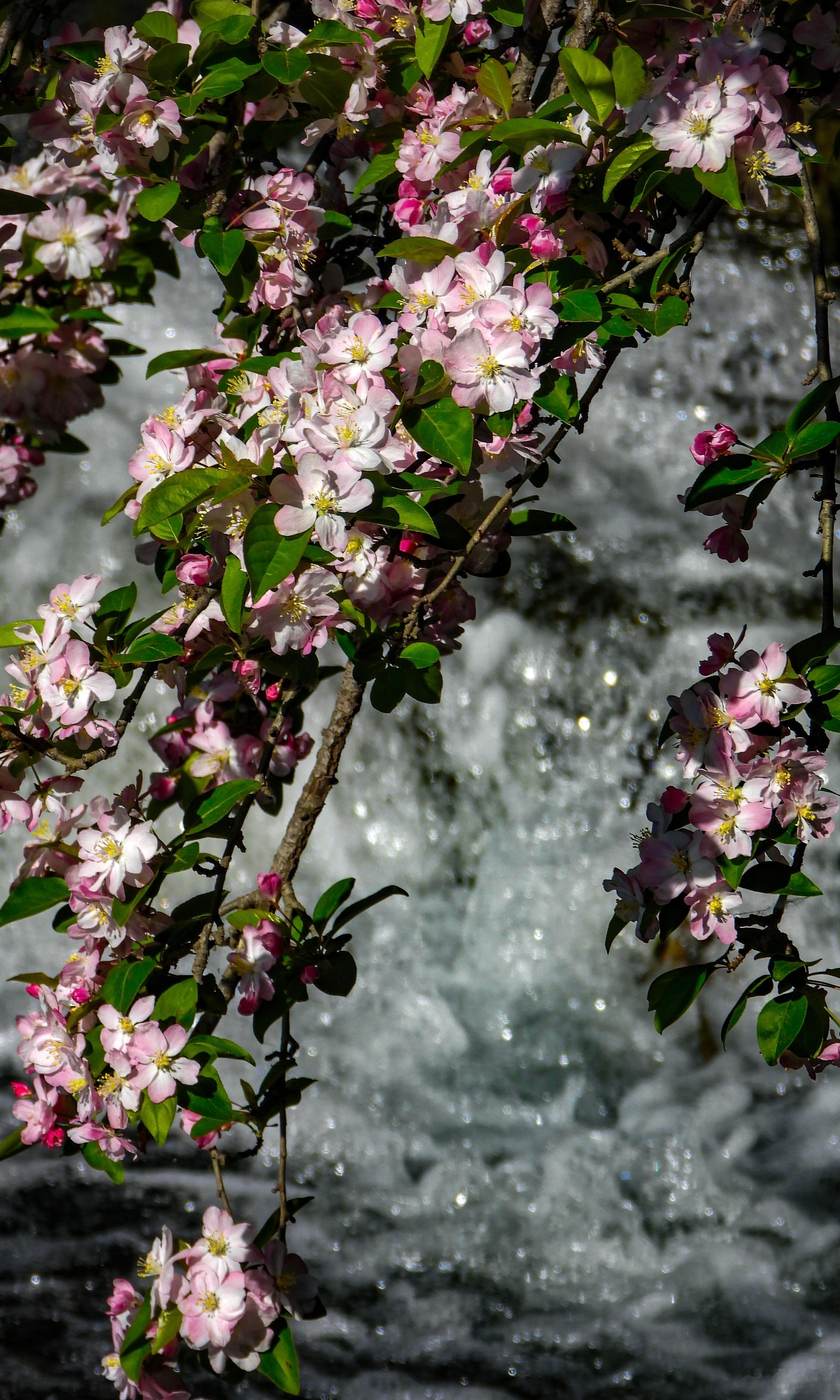 【奥林匹克森林公园 海棠花溪】奥森春事晚,水畔海棠稠。粉雪覆危石,红妆照浅流。衣