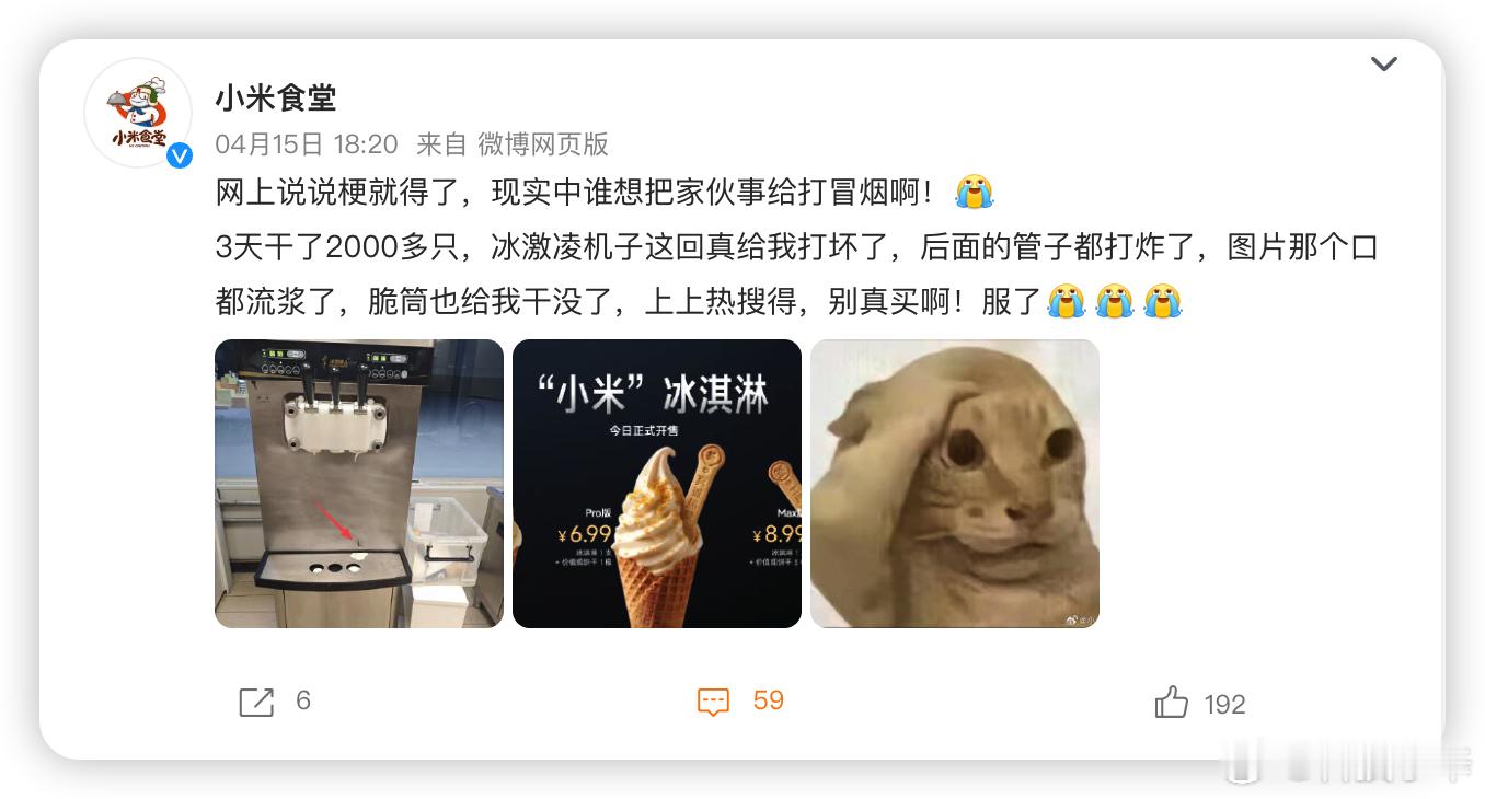 笑死,小米食堂推出冰激凌的时候,上了一波热搜。最近火的不得了,3天卖了2000多只,说是把机器都干报废了。 小米食堂3天卖2000多只冰淇淋
