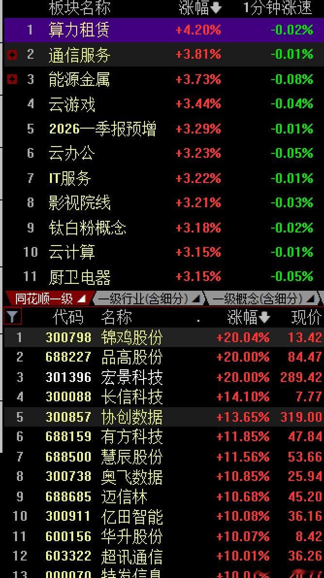随着前面pCB概念,CPO光模块,光纤概念等连续大涨后出现了分化,按照前面板块轮动推演,其一,目前到了算力产业链走强,AI的前端,算力硬件软件,量子科技,IT服务云计算等信创概念方向,宏景刷出289历史新高大长腿20CM,真视通,利通电子,特发,超讯通信恒润,智微智能,中贝通信等领涨,所以周一选择了美利云,在昨天回踩20日线支撑后今天快速涨停,后面大数据信创,算力是重点当前前面热点CPO光模块pCB仍有机会的,“易中天”三股也是大涨刷新高,强者恒强AI发展需求激增,涨价预期存储芯片,消费电子,大模型等,还有稀土,锂矿锂电池等也会继续轮动的