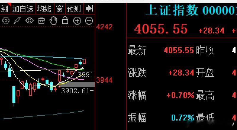 外围一片狂欢,昨晚纳指三连大阳线,涨了历史新高24026点收盘亚太日韩也抹去美伊的下跌,迈向了新阶段,小鬼子刷了历史新高59688点,韩棒子今天大涨2.2%,最高6231点,离前历史高点6347点还差16个点,没有了美伊地缘局势的影子了,强者恒强而我们大A呢,中规中矩小幅高开4030点后就震荡向上走,说明资金抱团拉起,比昨天的预期强的多,想回踩一下都没有,在算力概念,云办公,云计算,量子科技智普AI等承接下,最高到了4057点,午后小时拉起4055点收盘,一根阳线,站上4050压力位,但注意上方60日线压力按照趋势,在上方半年线震荡消化是基调