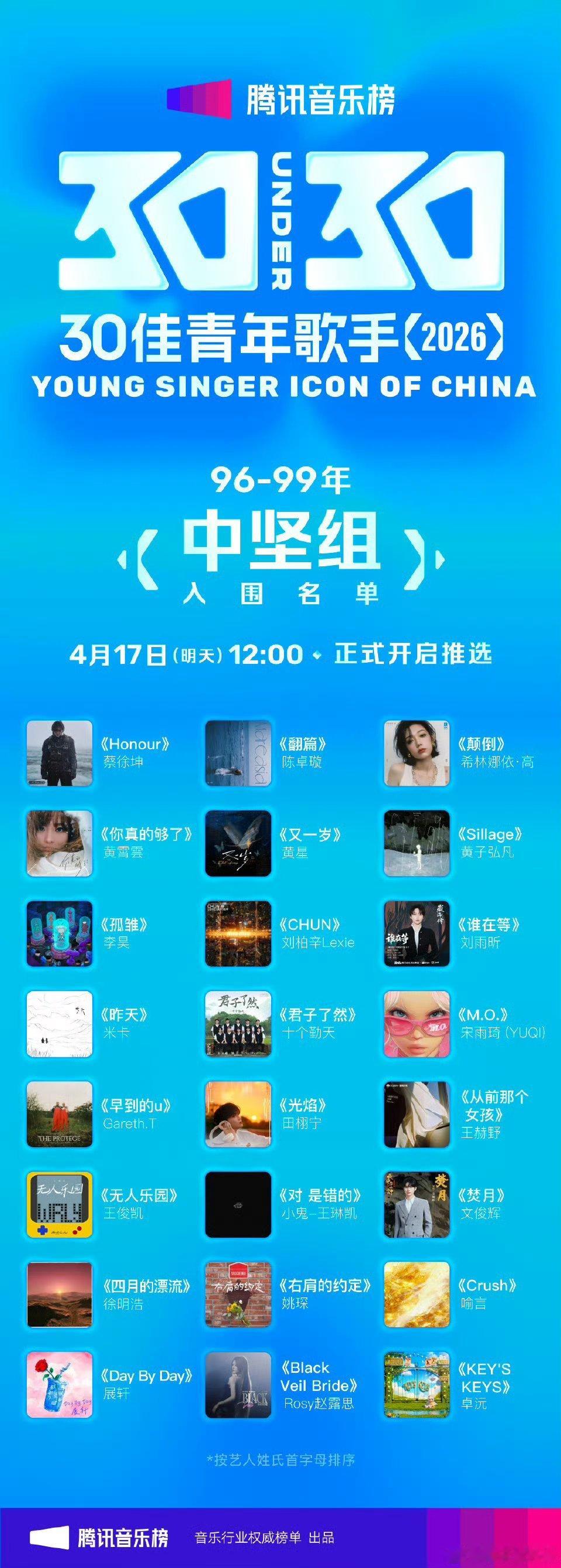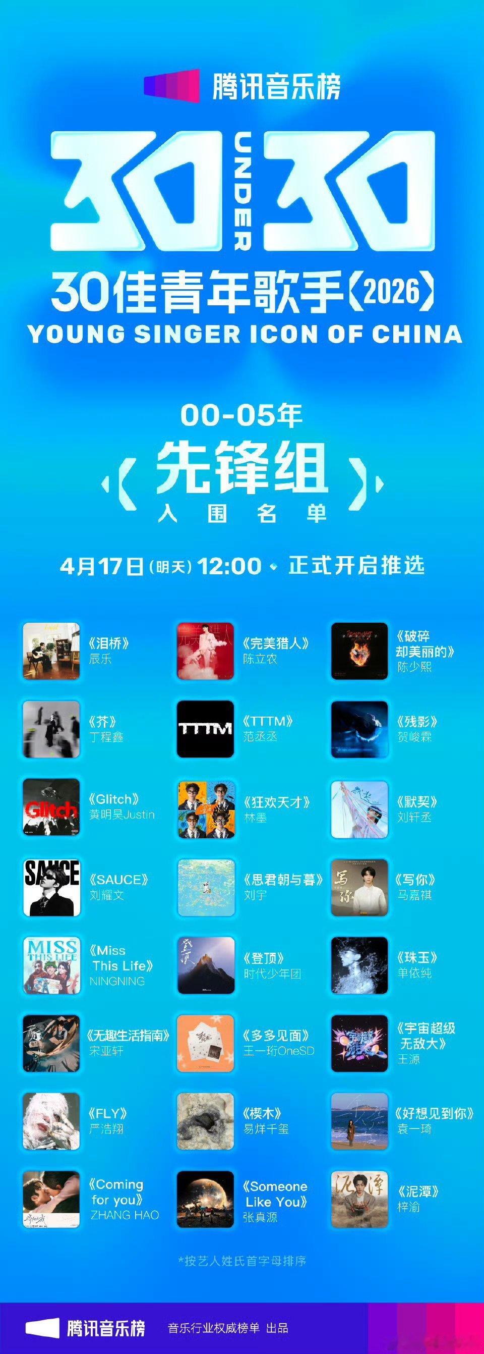 田栩宁入围30佳青年歌手🎉恭喜田栩宁、梓渝双双入围2026腾讯音乐榜30佳青年歌手!中坚组田栩宁凭《光焰》传递成长力量,跨界实力获权威认可 ;先锋组梓渝以《泥潭》横扫榜单,创下Billboard中国区TOP1等多项纪录。两位新生代音乐人用作品说话,实至名归!未来继续发光发热✨梓渝入围30佳青年歌手