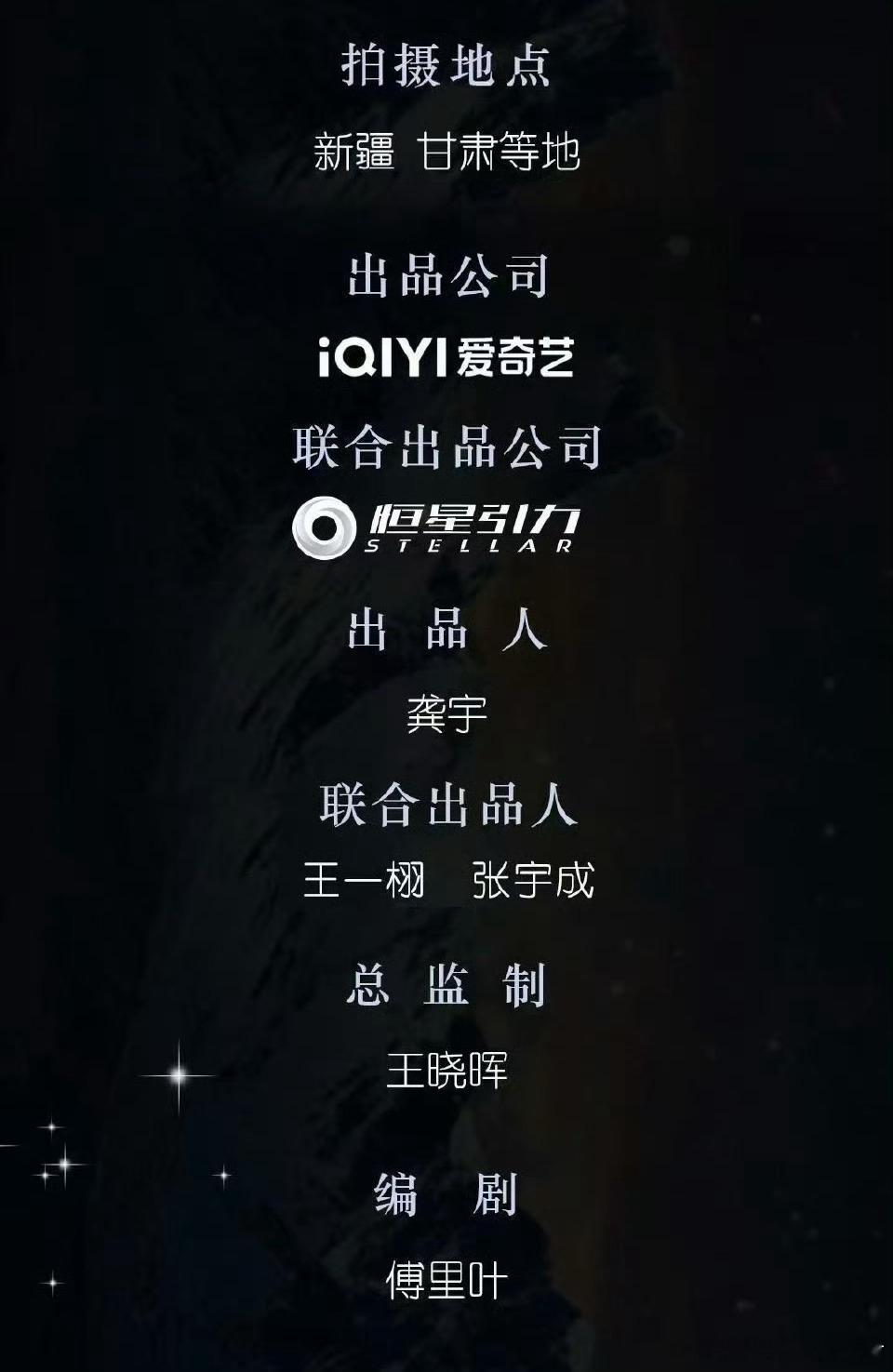 电视剧《许你星河千里》主演:丞磊、沈羽洁出品:爱奇艺、恒星引力总监制:王晓晖编剧:傅里叶开机时间:2026年5月27日拍摄地:新疆、西安、甘肃等地拍摄周期:110天