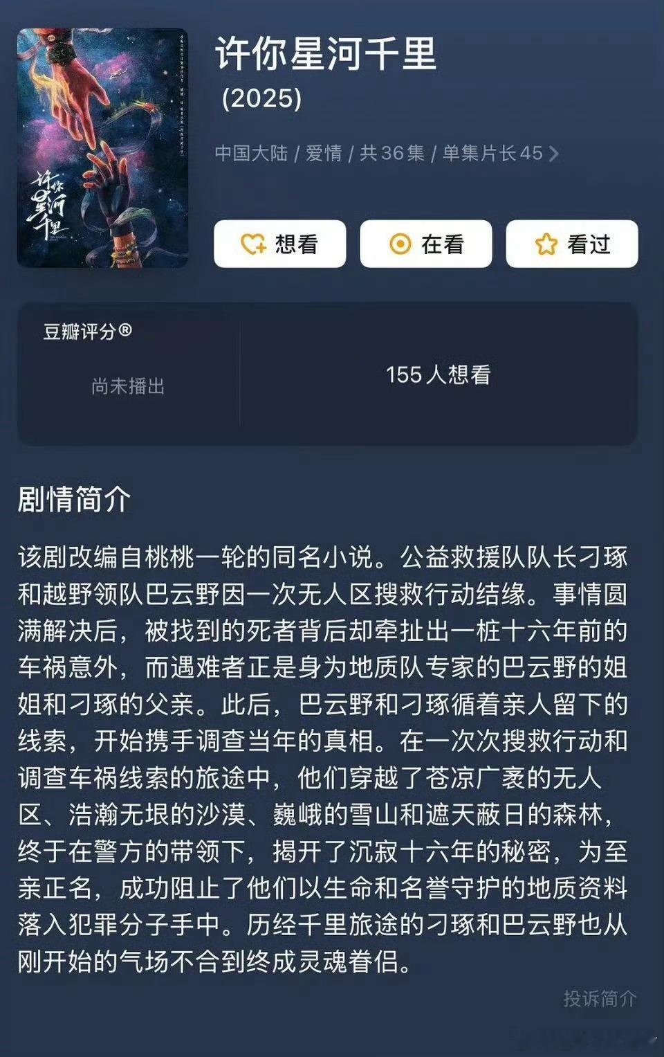 电视剧《许你星河千里》主演:丞磊、沈羽洁出品:爱奇艺、恒星引力总监制:王晓晖编剧