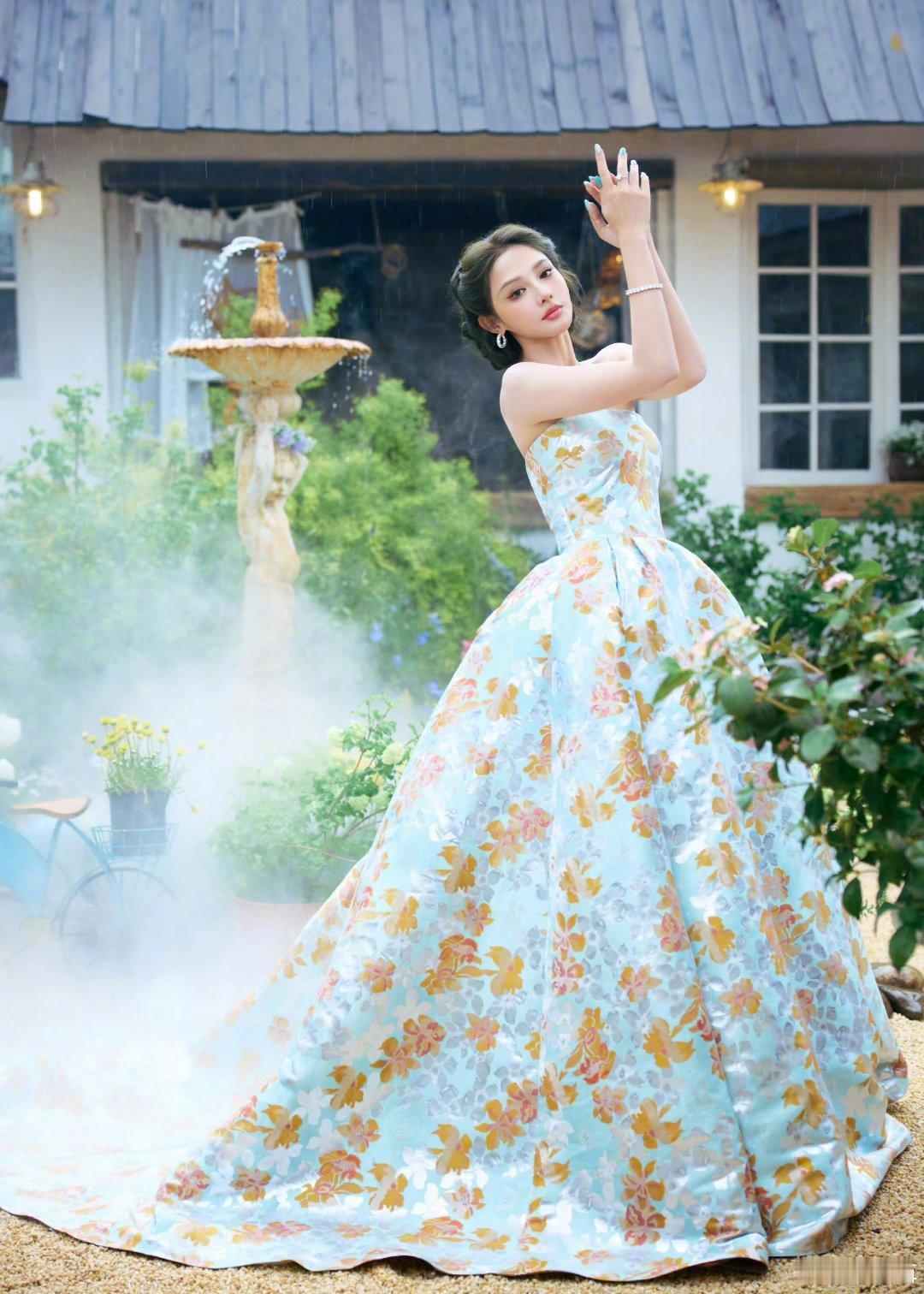 彭小苒碎花礼服温婉又灵动,碎发修饰得恰到好处,搭配钻石项链和抹胸礼裙,完全是公主
