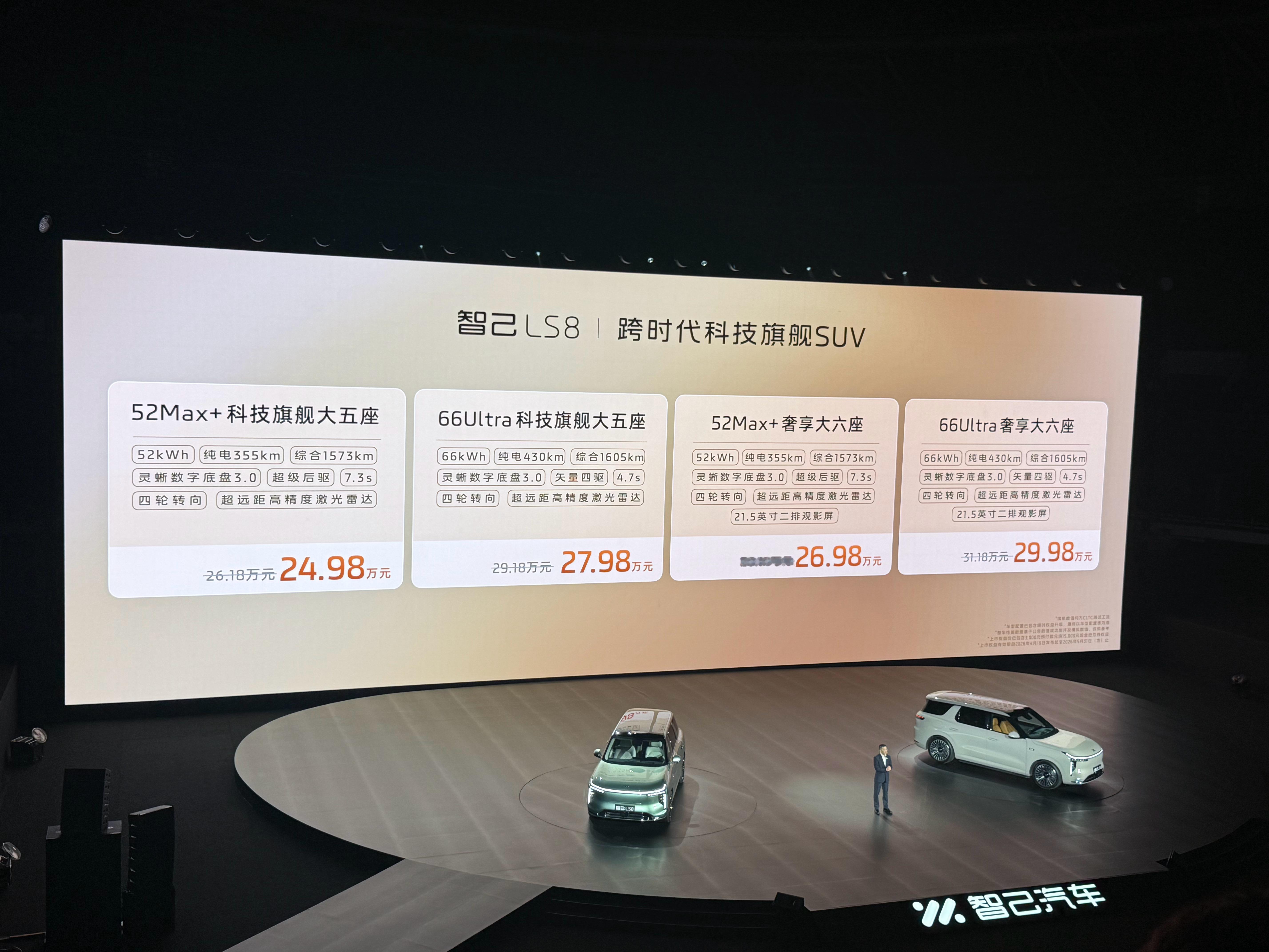 智己LS8 52Max+ 大五座:24.98万元智己LS8 66Ultra 大五座:27.89万元智己LS8 52Max+ 大六座:26.98万元智己LS8 66Ultra 大六座:29.98万元