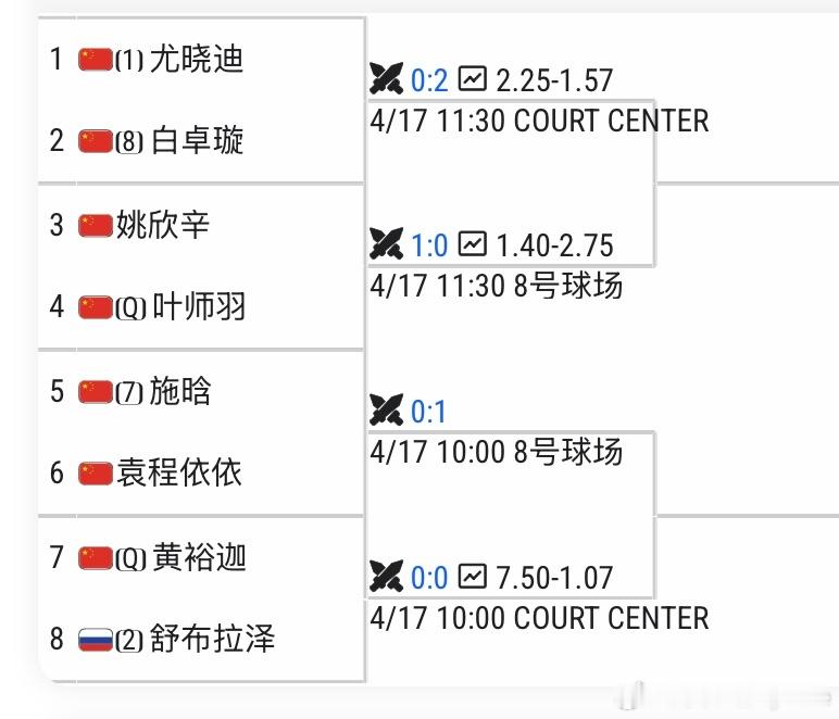 这样女单八强 占7席🇨🇳尤晓迪vs🇨🇳白卓璇🇨🇳姚欣辛vs🇨🇳叶师羽[Q]🇨🇳施晗vs🇨🇳袁程依依[Q]🇨🇳黄裕迦vs🇷🇺舒布拉泽