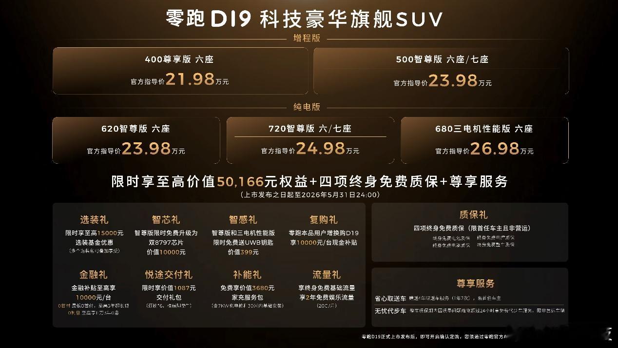 零跑D19满配豪华上市21.98万起零跑十年磨一剑,这次直接拿出王炸——全新旗舰SUV零跑D19正式上市,21.98万起的价格,直接把旗舰SUV的价格打穿,彻底颠覆“旗舰必高价”的规矩!作为零跑D平台首款车型,D19定位科技豪华旗舰SUV,提供纯电、增程双动力,还有六座、七座可选,完美适配家庭出行。增程版纯电续航直接干到500km,日常通勤纯电够用,长途远行无焦虑;纯电版最高续航720km,搭配1000V高压架构,充电15分钟就能补能350km,冬天也不打折。车内舒适度直接拉满,三排都是旗舰体验,二排零重力座椅、第三排宽敞不挤,还有全球首发的车规级森野氧舱、8.1L冷暖冰箱,全家出行都舒服。智能方面更是行业顶格,首发双高通8797芯片,舱驾一体算力超强,端侧AI大模型比真人还懂你,五屏交互+AR-HUD,科技感直接拉满。驾控与安全也毫不含糊,自研底盘+双腔空悬,魔毯悬架滤震超稳,三电机版3秒级破百;车身83%高强度钢+2000Mpa热成型钢,电池十层航天防护,安全拉满。发布会还有费翔亲临代言,现在下定还能享至高50166元豪礼,四项终身免费质保。零跑用十年全域自研实力,把百万级体验做到20多万,这才是真正的科技普惠,家庭选旗舰SUV,闭眼冲零跑D19就对了!原来9系旗舰SUV价格也能这么香零跑发布会