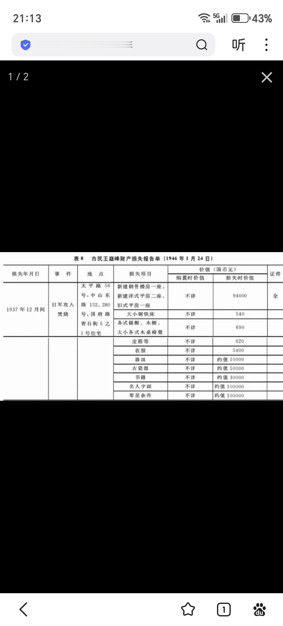 抗战胜利后,南京市抗战损失调查委员会组织财产损失普查。市民王嶷峰的家庭较富有,在1937年12月,他家财产损失近400000元(图1)。市民郭文贤的家庭较贫困,在1937年12月,他家财产损失257元(图2)