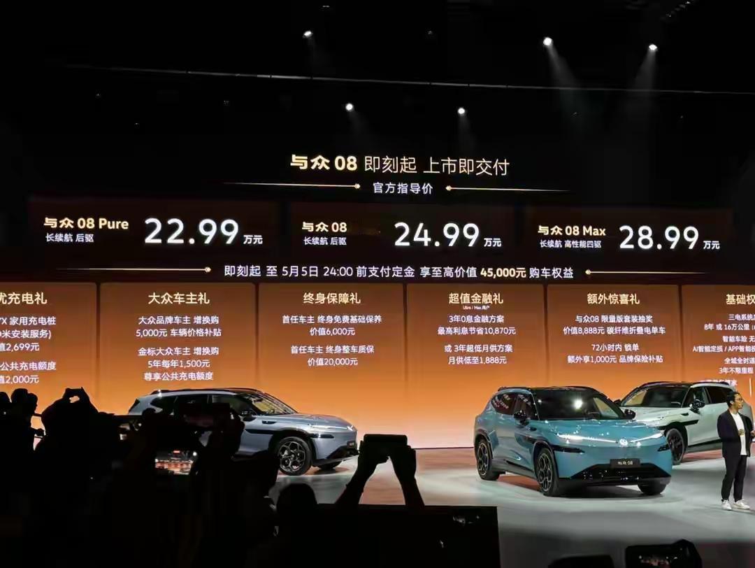 我承认,看到价格之前,我是准备开喷的。 4月16日晚,大众安徽把自家旗舰——与众08推向了市场。三款配置:Pure、Ultra、Max,指导价22.99万至28.99万元,相比之前的预售价格,正式上市直降了1万块。这年头新车上市能不涨反降,说实话,不像大众的作风,更像被新势力逼急了的节奏。