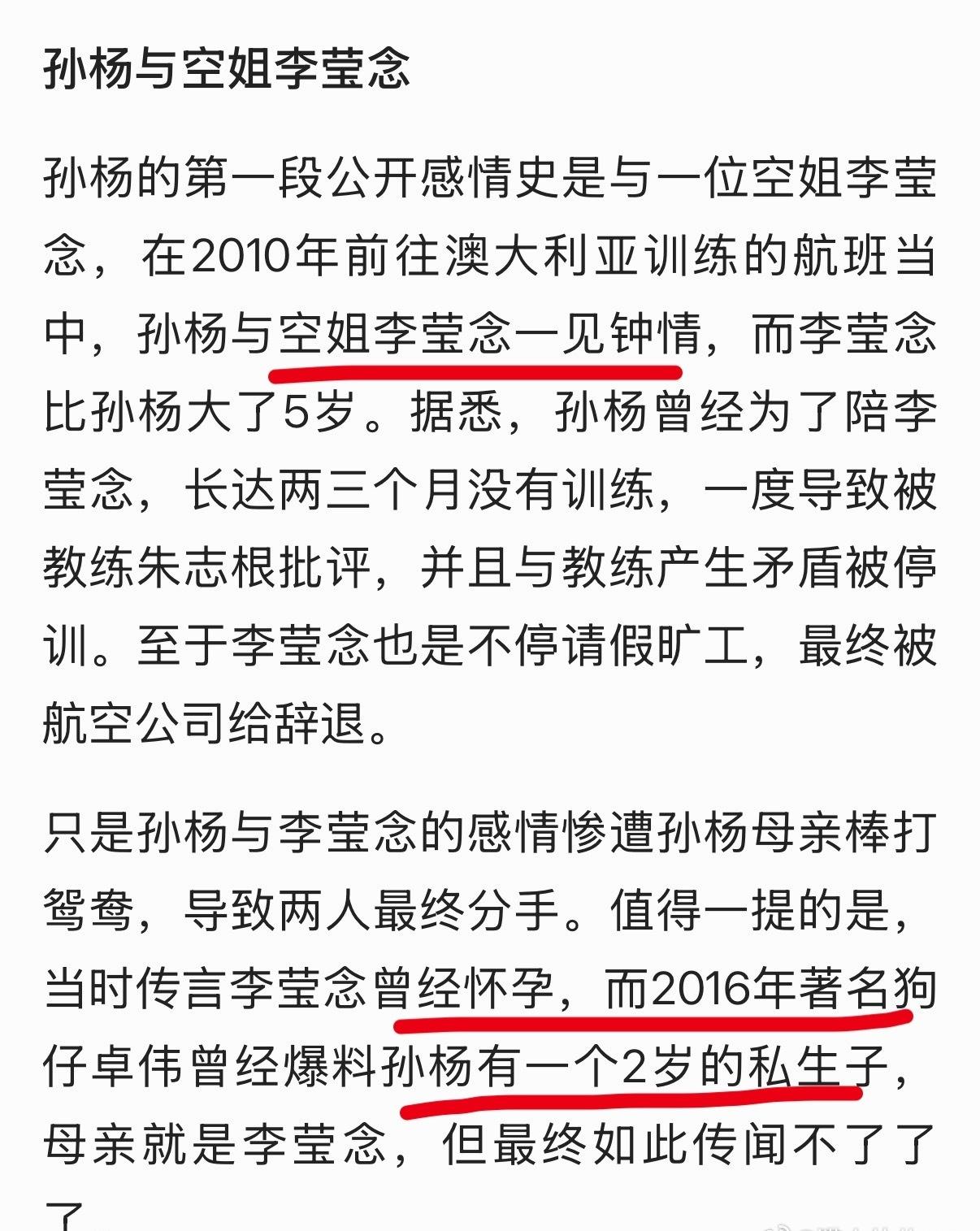 孙杨在10年的时候和一个空姐交往,女生比她大5岁,俩人爱得火热,耽误训练,引发了孙杨和教练的矛盾。空姐后来为了陪孙杨训练不停矿工被国航辞退。俩人应该交往了很长时间,12年孙杨夺冠以后还在一起。后来女方怀孕,孙妈妈棒打鸳鸯,女方最后还是把孩子生下来了。16年的时候,卓伟去拍,小孩2岁,现在应该12岁了。