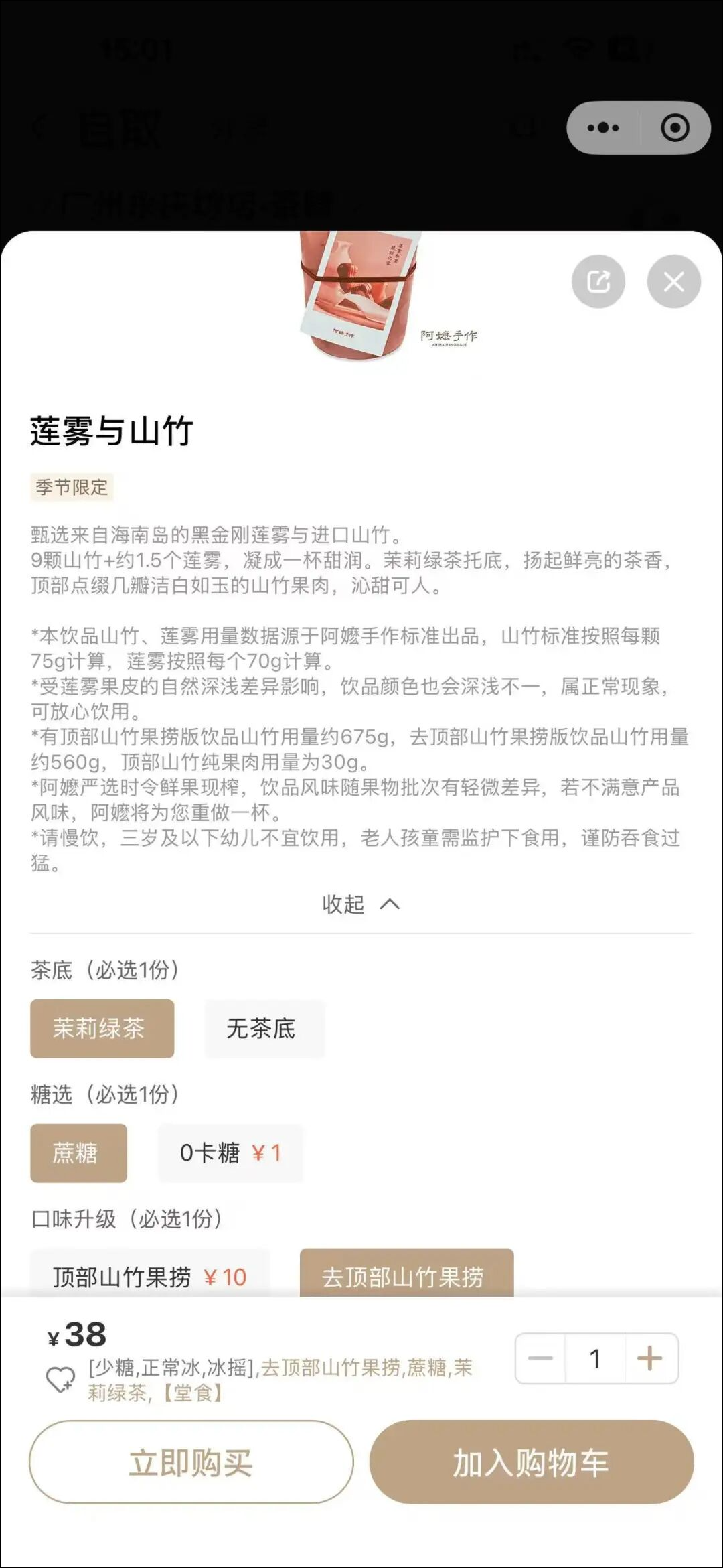 产品页面显示,该饮品售价48元一杯,若消费者选择“去顶部山竹果捞”,饮品售价38元。