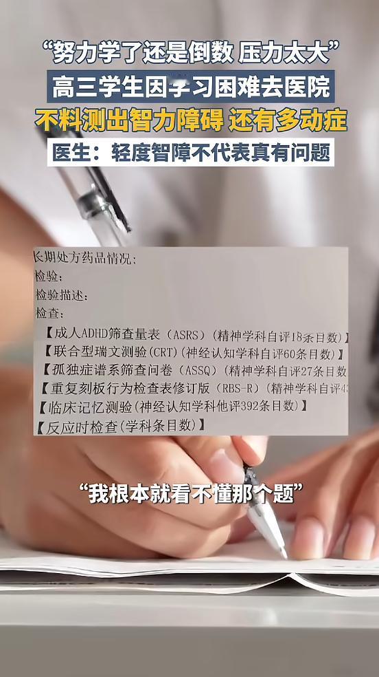 (信息来源:《“努力学了还是倒数,压力太大”,高三学生因学习困难去医院,不料测出智力障碍,还有多动症》封面新闻)