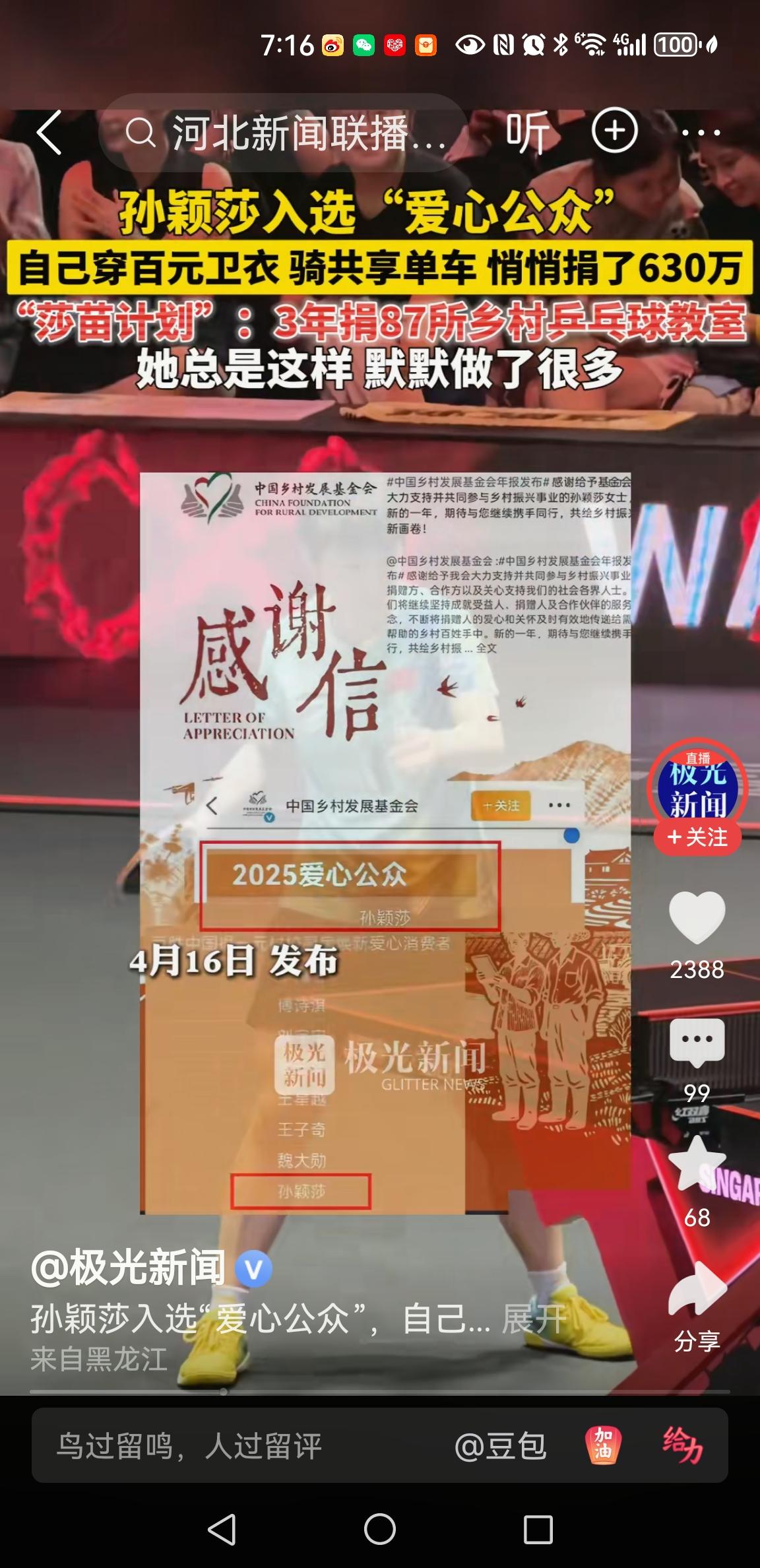 国乒选手孙颖莎的名字赫然出现在2025“爱心公众”的名单。