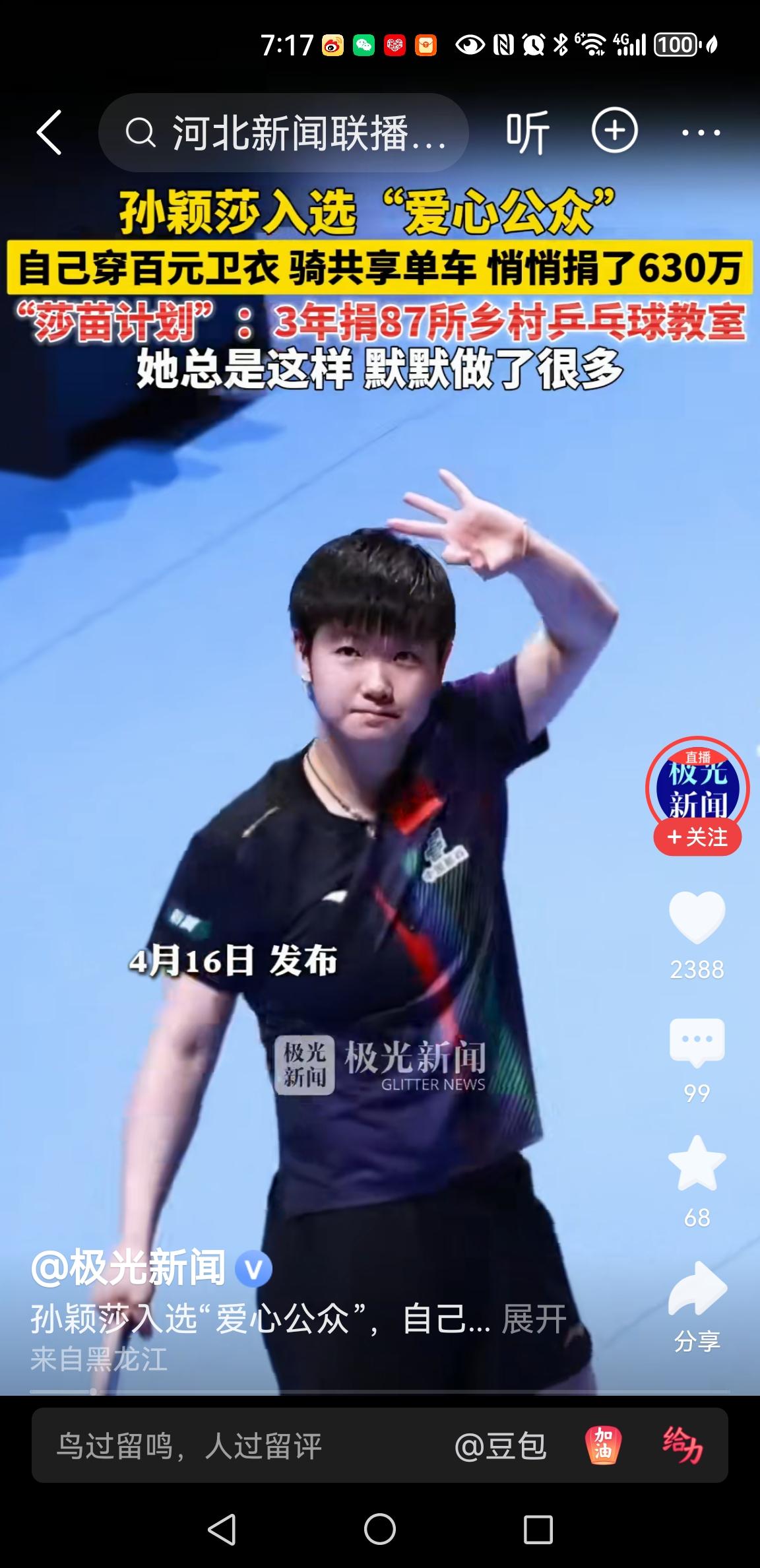这不是第一次听说莎莎捐款献爱心,每一场大灾大难面前,我们都能看见孙颖莎的爱心捐款。