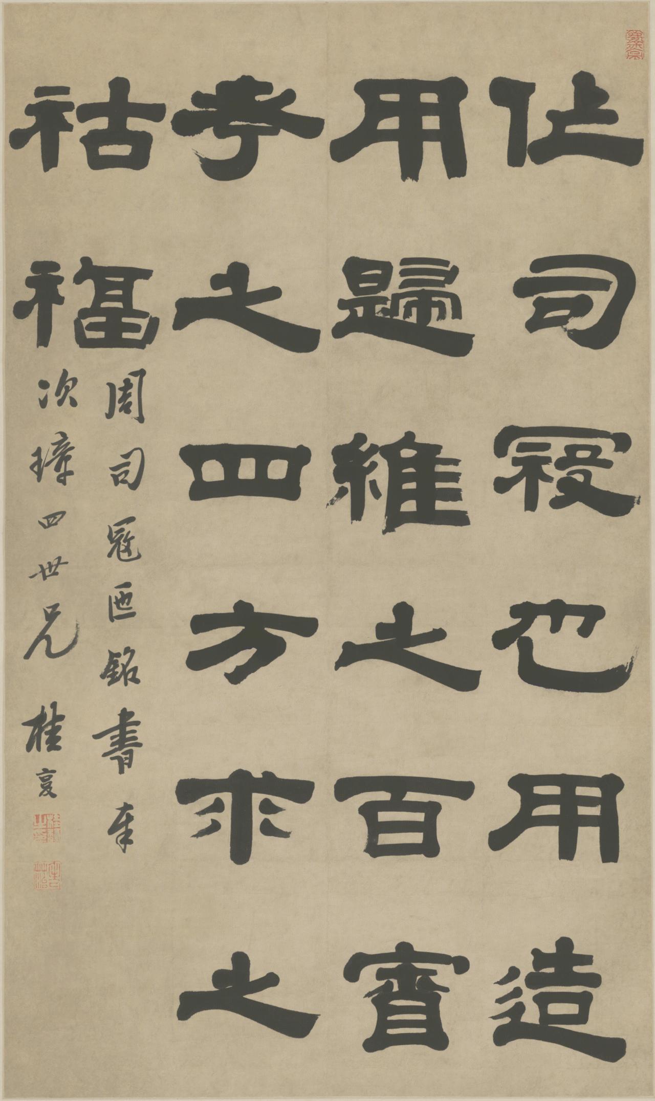 商周时期的青铜鼎彝,给人的感觉是沉甸甸的、造型端正的、纹饰简朴而又充满内在力量的。用这个比喻来评价桂馥的隶书,主要指向的是那种外在的肃穆感和内在的坚实度。