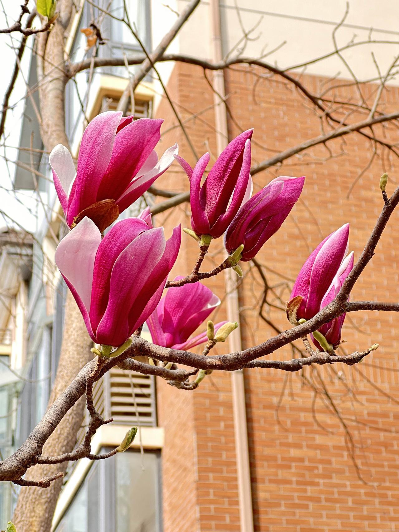 三月底的街上还有点冷,路边的梧桐光秃秃的,枝条伸着,看着跟骨头架子似的。可就在这一片灰不溜秋的颜色里,有棵紫玉兰开了,开得大大方方的,又安安静静的。