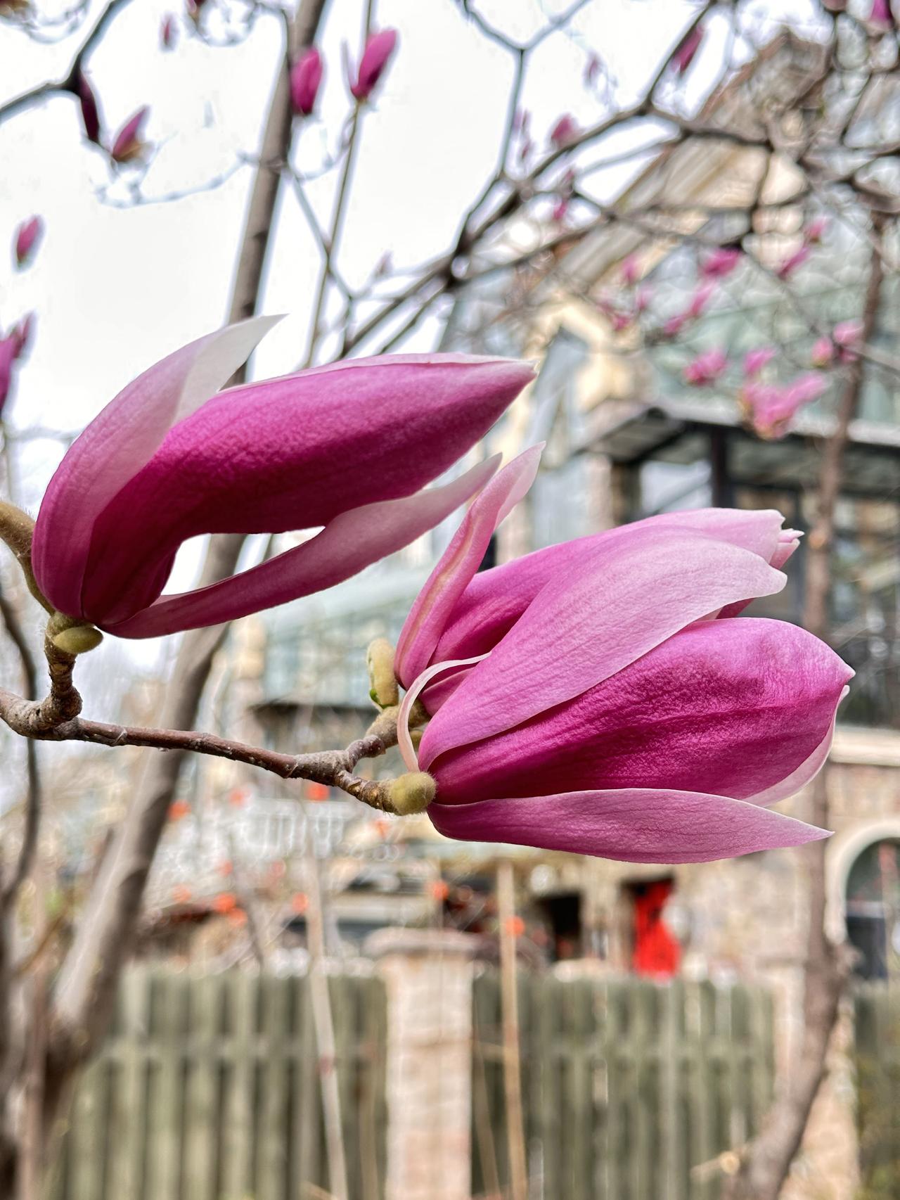 那些还没开的花苞也挺好看的。毛茸茸的壳上泛着粉紫粉紫的颜色,跟做了个甜甜的梦似的,踮着脚站在枝头往外面看。我站在树底下看了好一会儿,心里想:这树玉兰可真够着急的,叶子还没长出来呢,花就抢着先开了。不过再一想,又觉得它挺聪明的——没有叶子跟它抢风头,这一树紫色开得特有底气,谁也比不过。