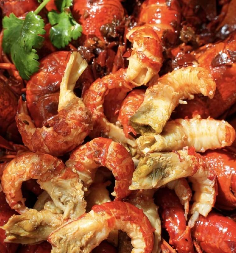 餐桌上,红色虾壳堆得像小山,沾满酱汁,旁边散落着纸巾,满满一盆小龙虾只剩空盆和残壳,看不到半点虾肉。