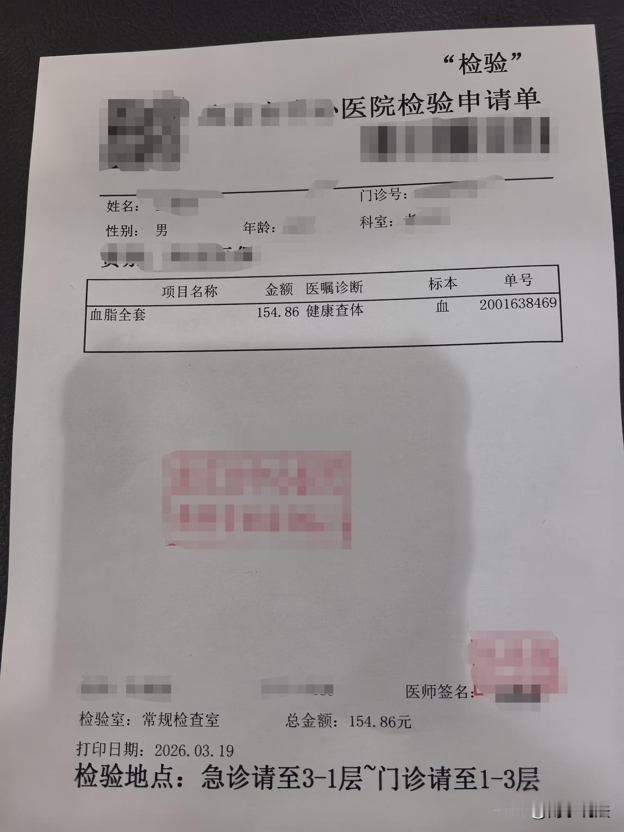 挂号后我请接诊医生开检验单。为了让医生明白我想检验的项目,我特地拿出以前在这家医院做的血检报告单,提示他检验内容必须包括血糖,低密度脂蛋白等几项(我特地划了线),因为我最关注这些。他开了“肝功全套”,“心肌酶谱”等4个名称的检验单。我寻思肯定包括血脂项目。