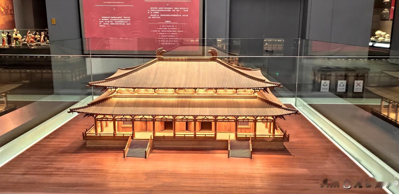 博物馆东北角还有按1:15比例复原的大明宫全景模型(长36米、宽26米),最高宫殿约2米。配合灯光演示不同时段的宫殿功能,沉浸式地感受这座面积相当于法国3个凡尔赛宫的皇家建筑群的恢弘气魄。