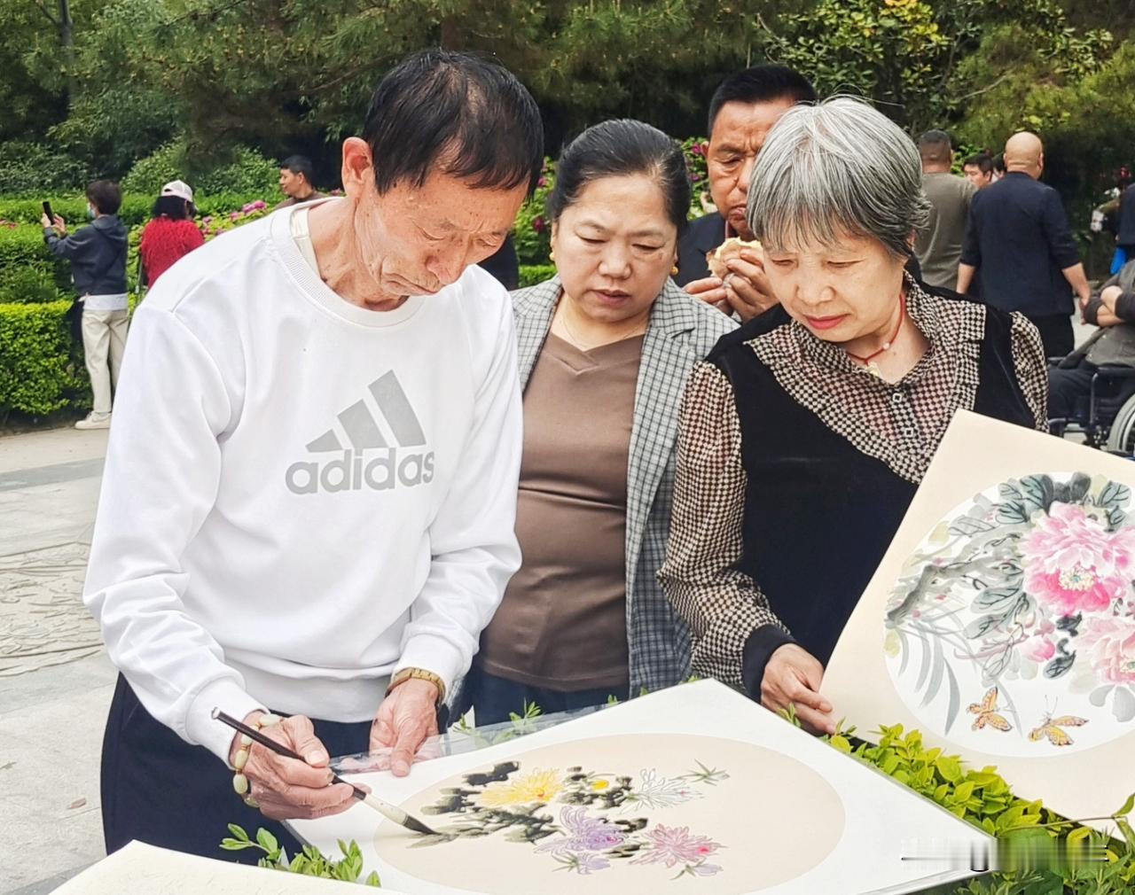 尤其是层层叠叠的花朵鲜活饱满,如绸似锦,满园的红花绿叶和馥郁的芳香,让人心旷神怡,令人陶醉。有画家凝神观察牡丹绽放的瞬间现场绘画,还有许多市民、游客手持相机和手机漫游在花海之中,痴情地拍片摄像,脸颊被身旁的牡丹花映得格处红润。