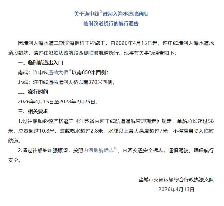 盐城市交通运输综合行政执法支队发布航行通告,因淮河入海水道二期滨海枢纽工程施工,连申线淮河入海水道地涵段自4月15日起至2028年2月25日封航,过往船舶需从该航段西侧指定临时航道绕行,并明确了临时航道出入口位置,同时对可通行船舶尺寸、航行安全等事项作出具体要求。