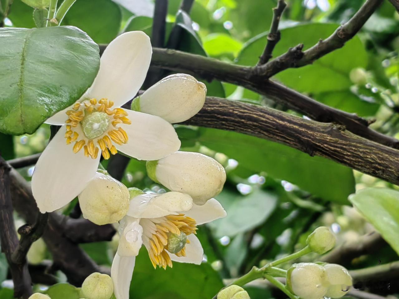 上午我在公园里漫步,空气中弥漫着橘子的花香味。我走近一看,雪白的橘子花绽放着,黄色的花蕊点缀在其中,花香扑鼻,连空气都是香甜的。