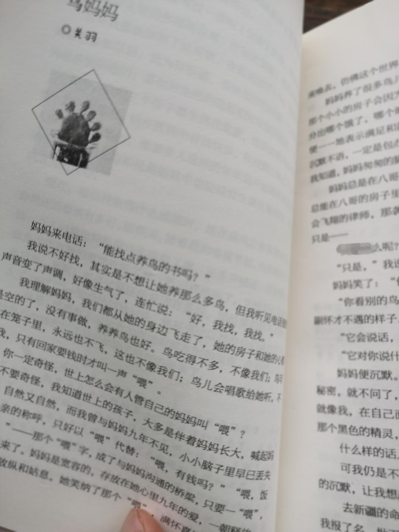 从书架的一本书里,看到自己写的《鸟妈妈》,这篇小文原载《读者》原创版,被转载的比较多,还入选过中学试题。