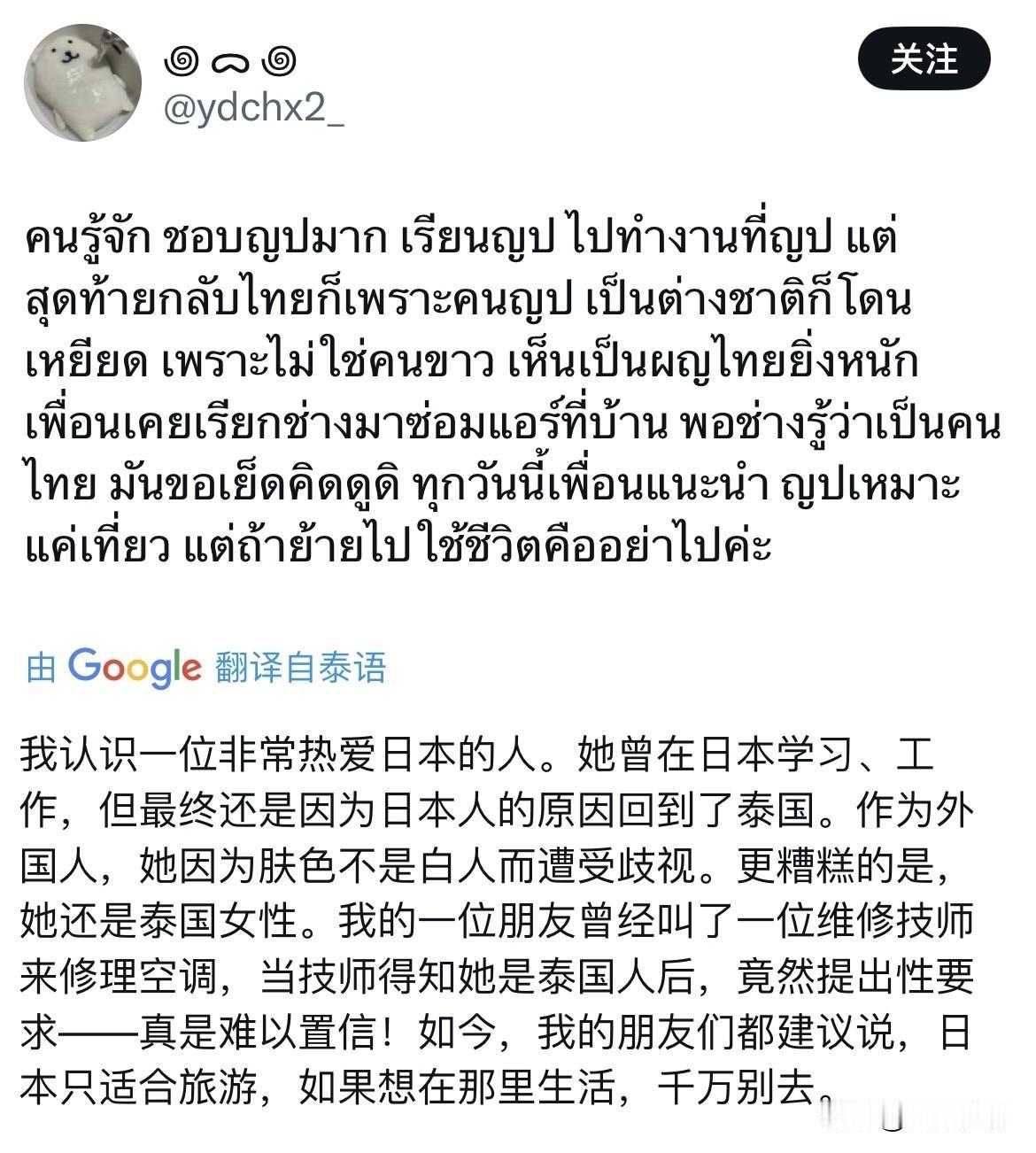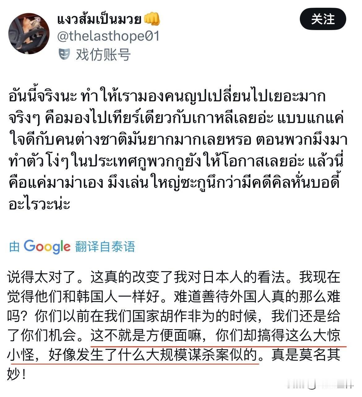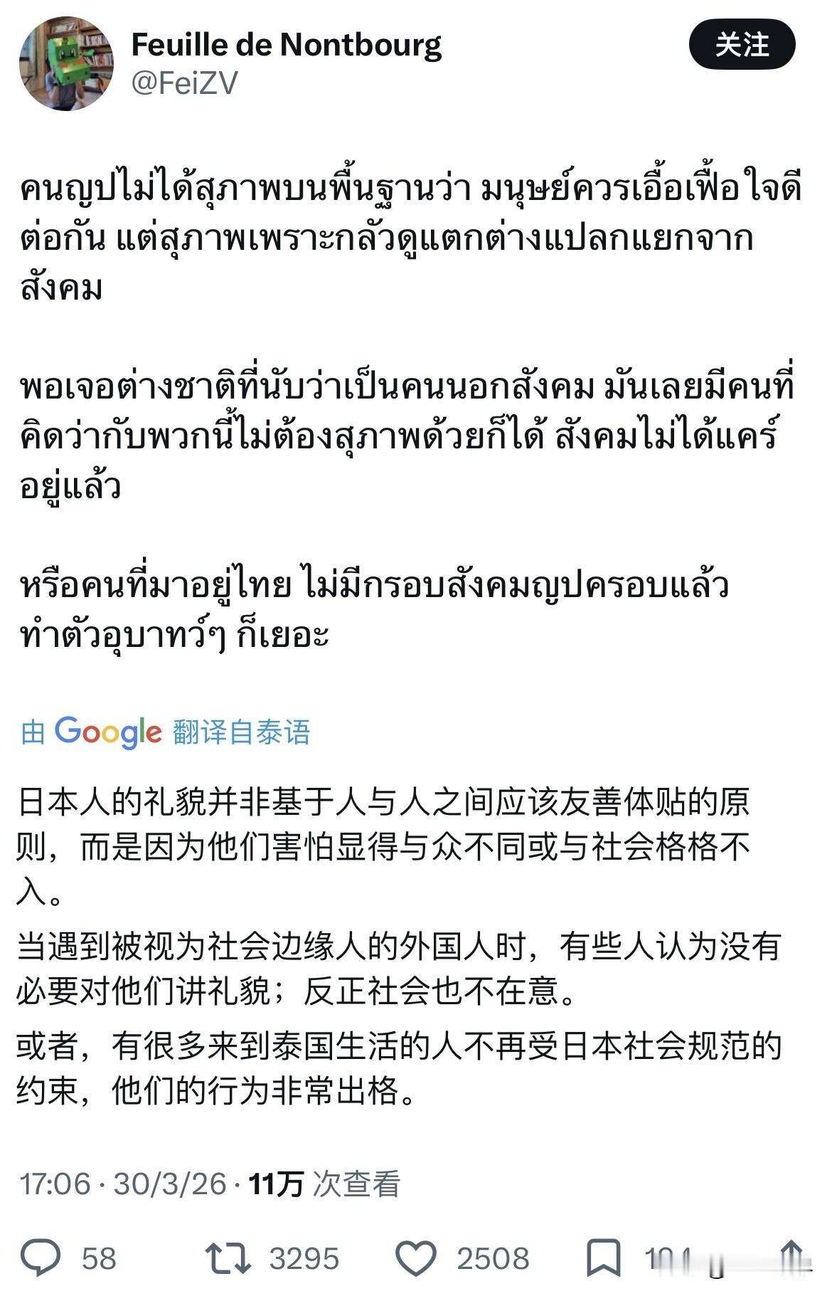 经济差→找替罪羊→外国人抢了我们的工作→邻国威胁我们的安全……日本网民转发这些叙事,不是因为他们真的恨外国人,而是因为他们需要一个解释,为什么我努力工作,生活还是越来越难?这个解释不能是“我们失败了”,因为日本文化不允许公开批评权威,所以只能是“外国人的错”。他们对其他亚裔的种族主义和歧视,只不过是他们对自己作为“白人亚洲人”的优越感的执着。