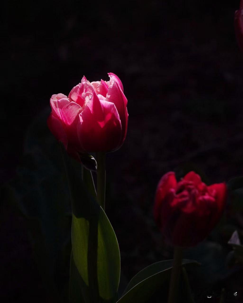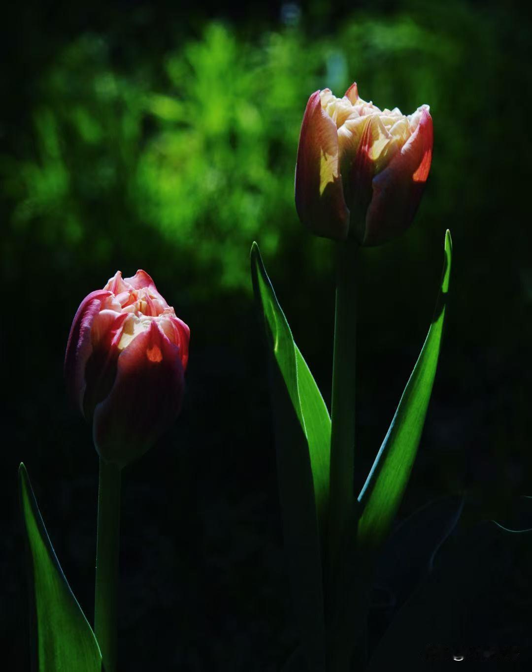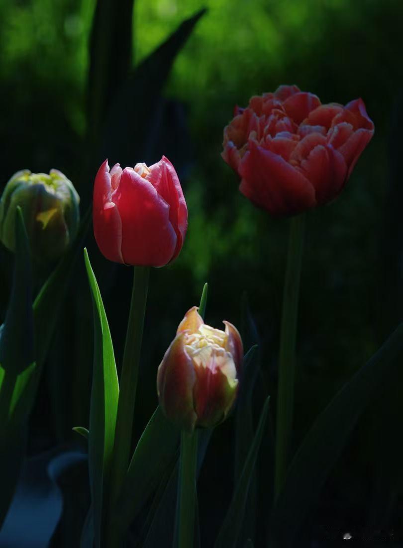 树下种植了大片郁金香,由于树荫的遮盖,阳光漏下来很少。但漏下来的一束光线照在哪个花朵上哪个花朵就灿烂。而且这个光束是移动的,也许周边的花朵都有可能沐浴阳光灿烂一会。