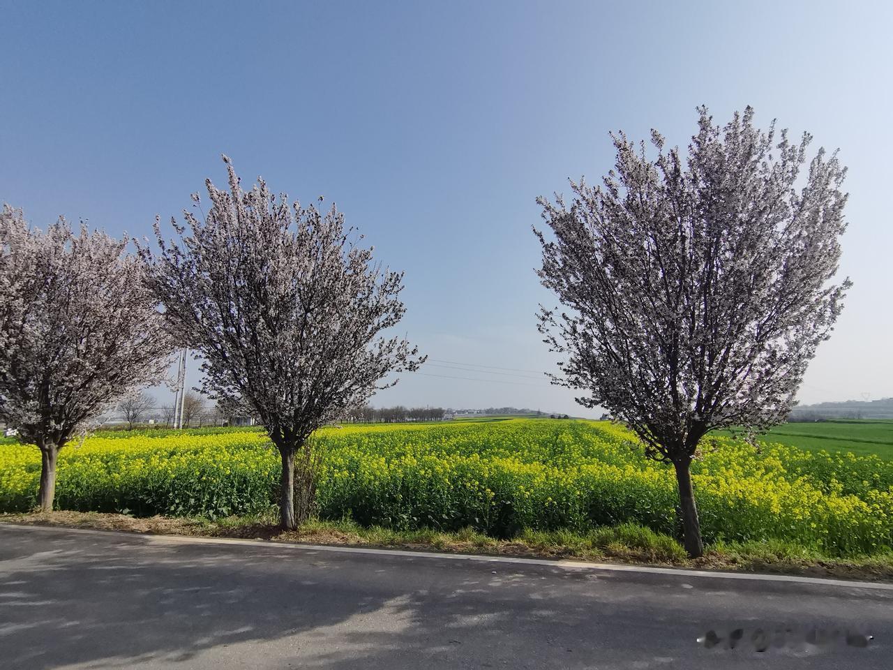 骑行天齐原,黄的菜花,白的杏花,粉的桃花,绿的麦苗,不大的原面好似五彩画。