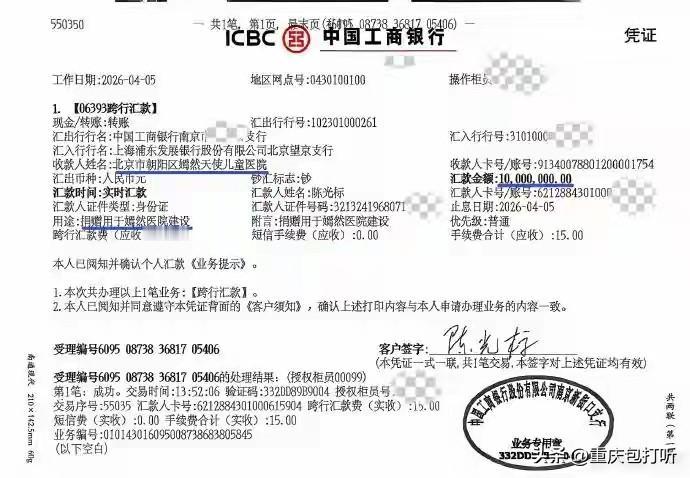 “中国首善”陈光标是真的捐了1000万元,嫣然医院发表了“感谢证书”算是对这件事
