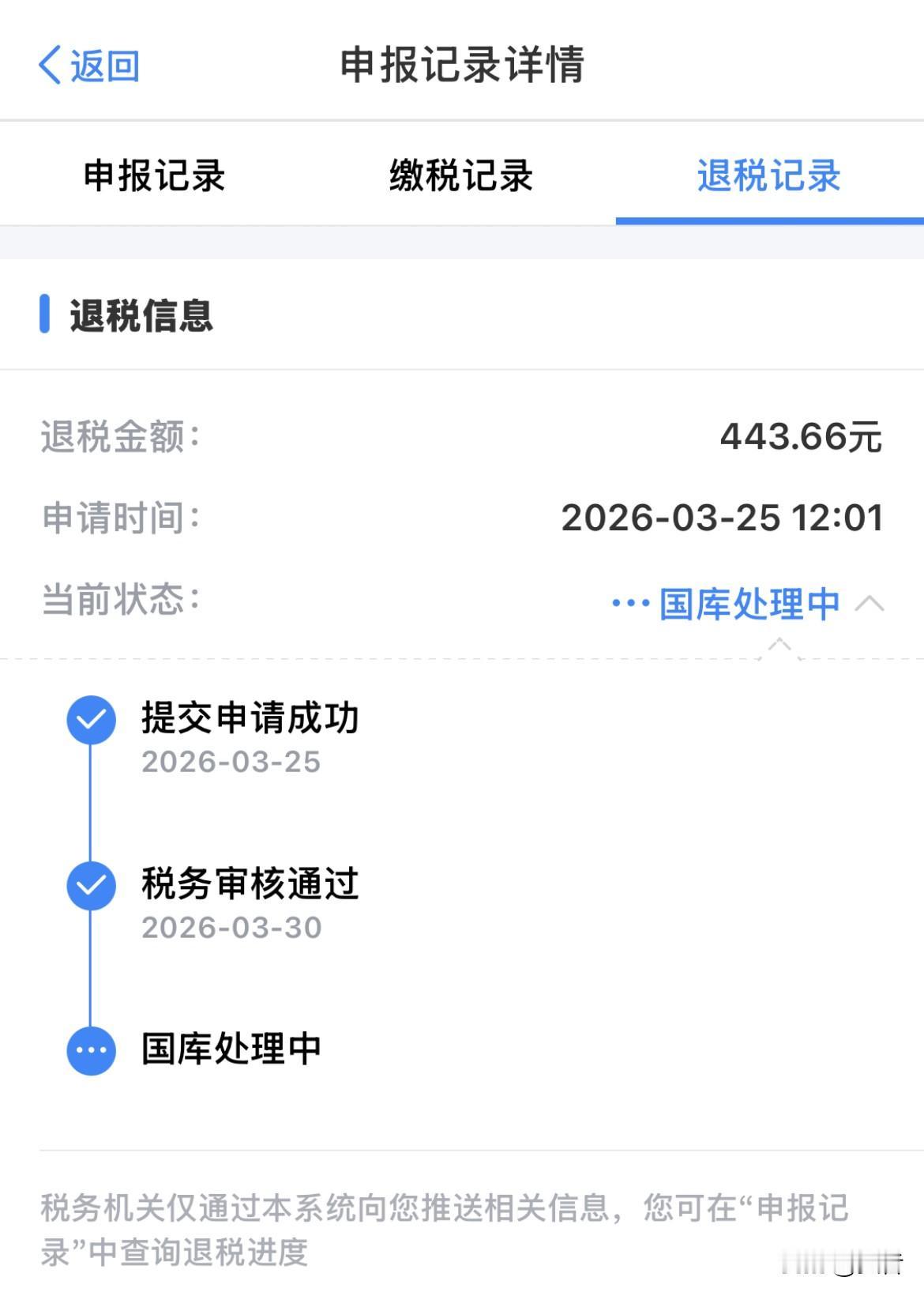 我是3月25日办理的,刚才查了一下,预计退税443.66元,目前显示正在国库处理中,坐等到账!💰