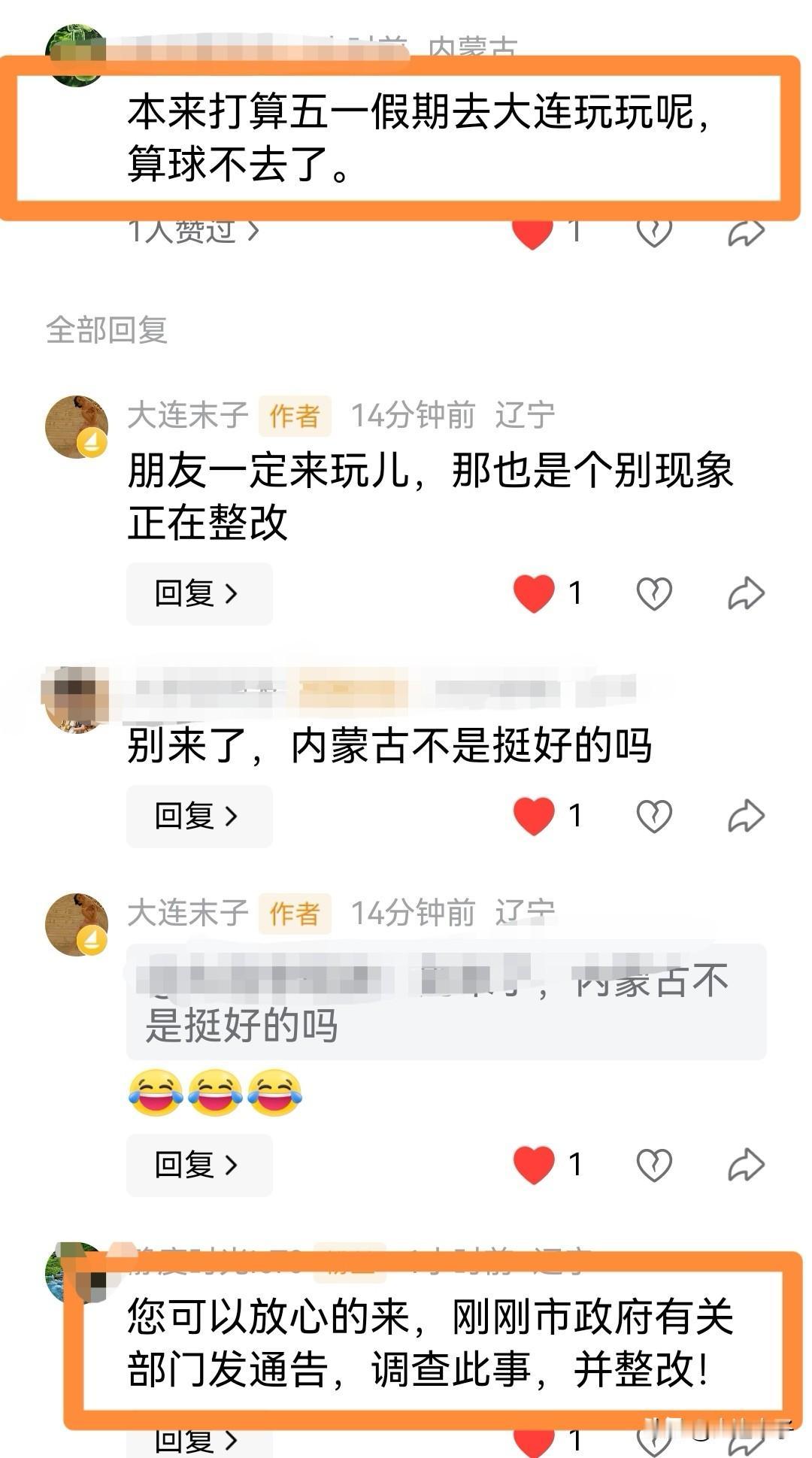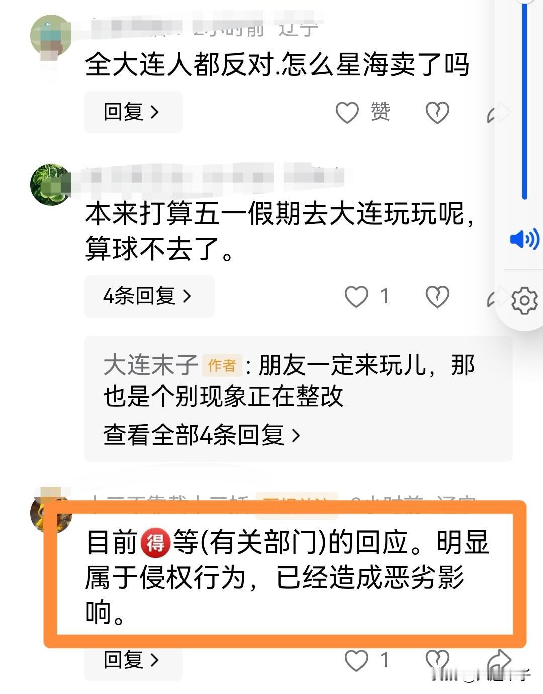 事情出现以后,造成不良的后果,引起很多人的不满,内蒙古的朋友说,本来五一想带着孩子到大连来玩儿,这个事件发生之后,人家不来了(图三图四)。